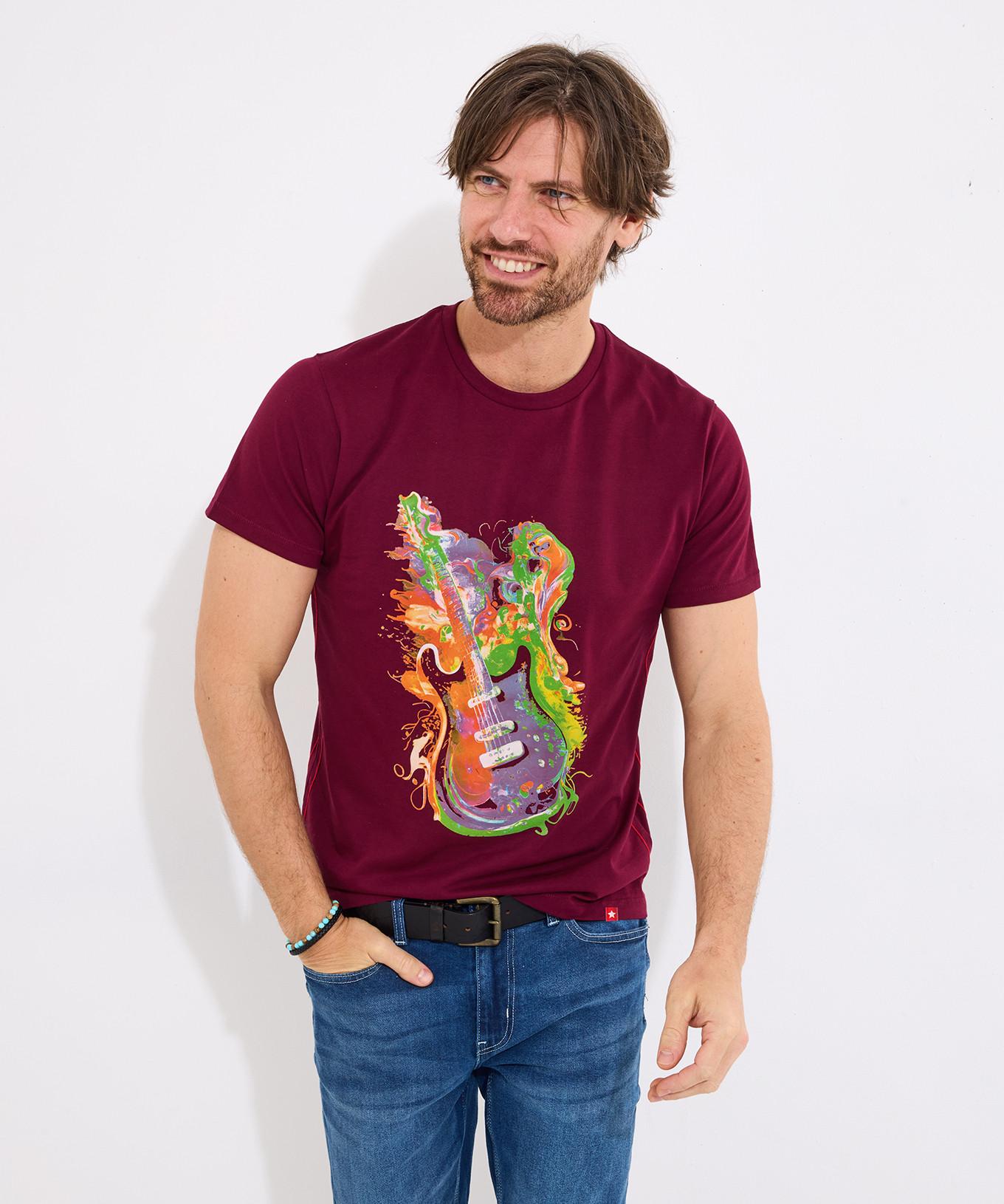 Ce T-shirt présente un imprimé graphique vibrant d'une guitare, ce qui en fait une pièce maîtresse pour toute garde-robe décontractée. Le design est accrocheur et ajoute une touche artistique.