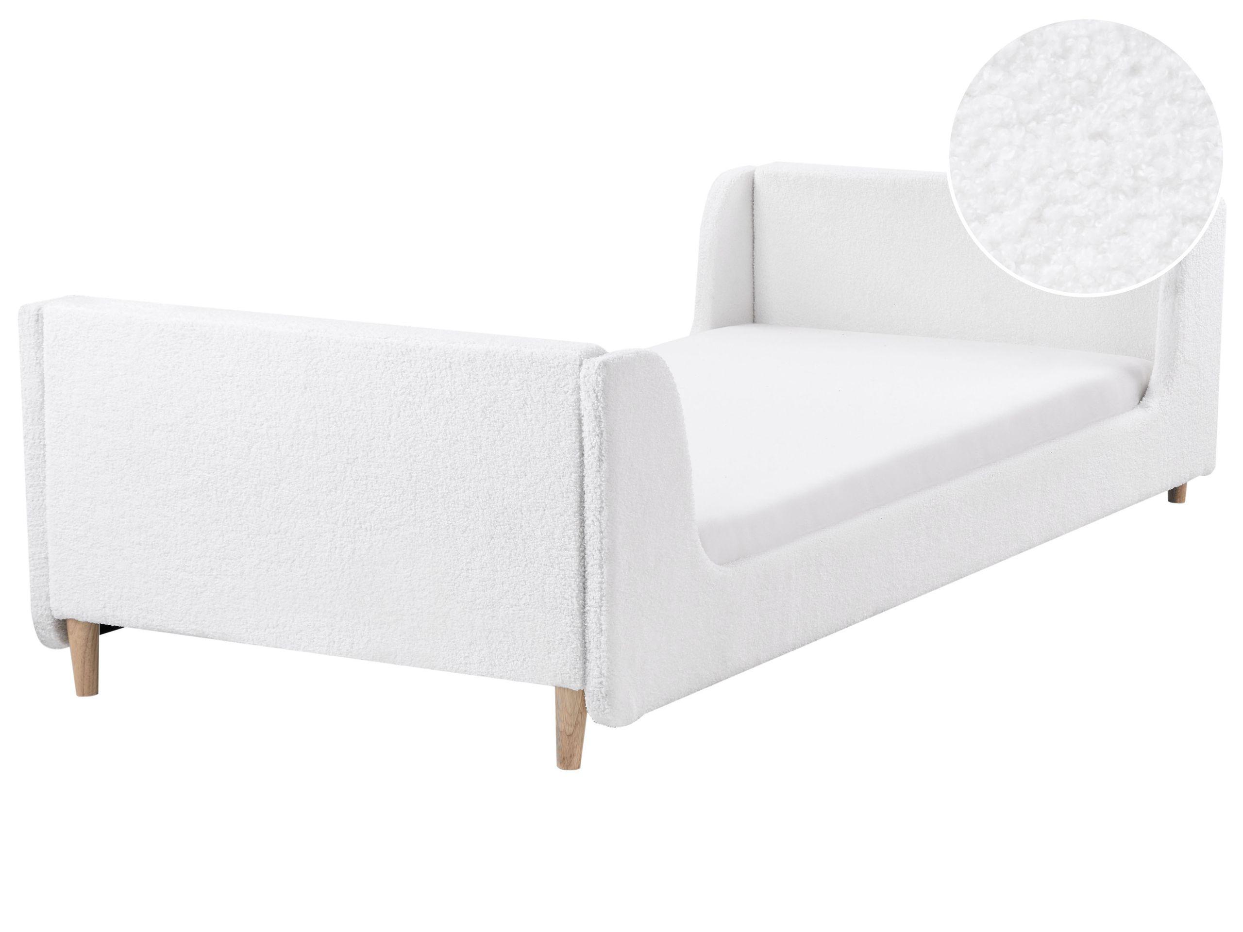 Lit élégant rembourré. Créez un espace de sommeil confortable et élégant avec ce lit simple au design magnifique. Enveloppé dans un tissu bouclé doux, il offre une sensation de chaleur et d'accueil, parfaite pour une chambre d'enfant. Le cadre légèrement incurvé avec des panneaux latéraux bas offre un environnement confortable et sûr tout en facilitant l'entrée et la sortie. Soutenu par des pieds robustes, ce lit est un mélange parfait de confort, de charme et de fonctionnalité.