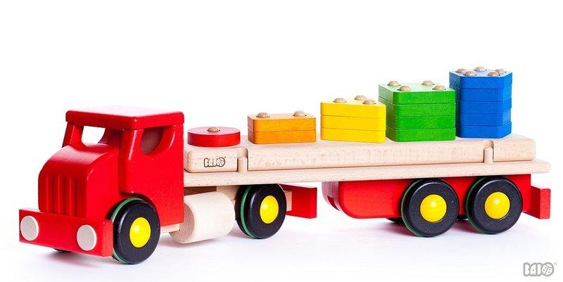 Grand camion PC rouge brut de chez Bajo. Ce n'est pas seulement un camion ! Il peut transporter de nombreuses formes géométriques sur sa remorque. Idéal pour apprendre les couleurs et les formes, ou même pour les premiers jeux arithmétiques. Dimensions : 50 x 10 x 14 cm.