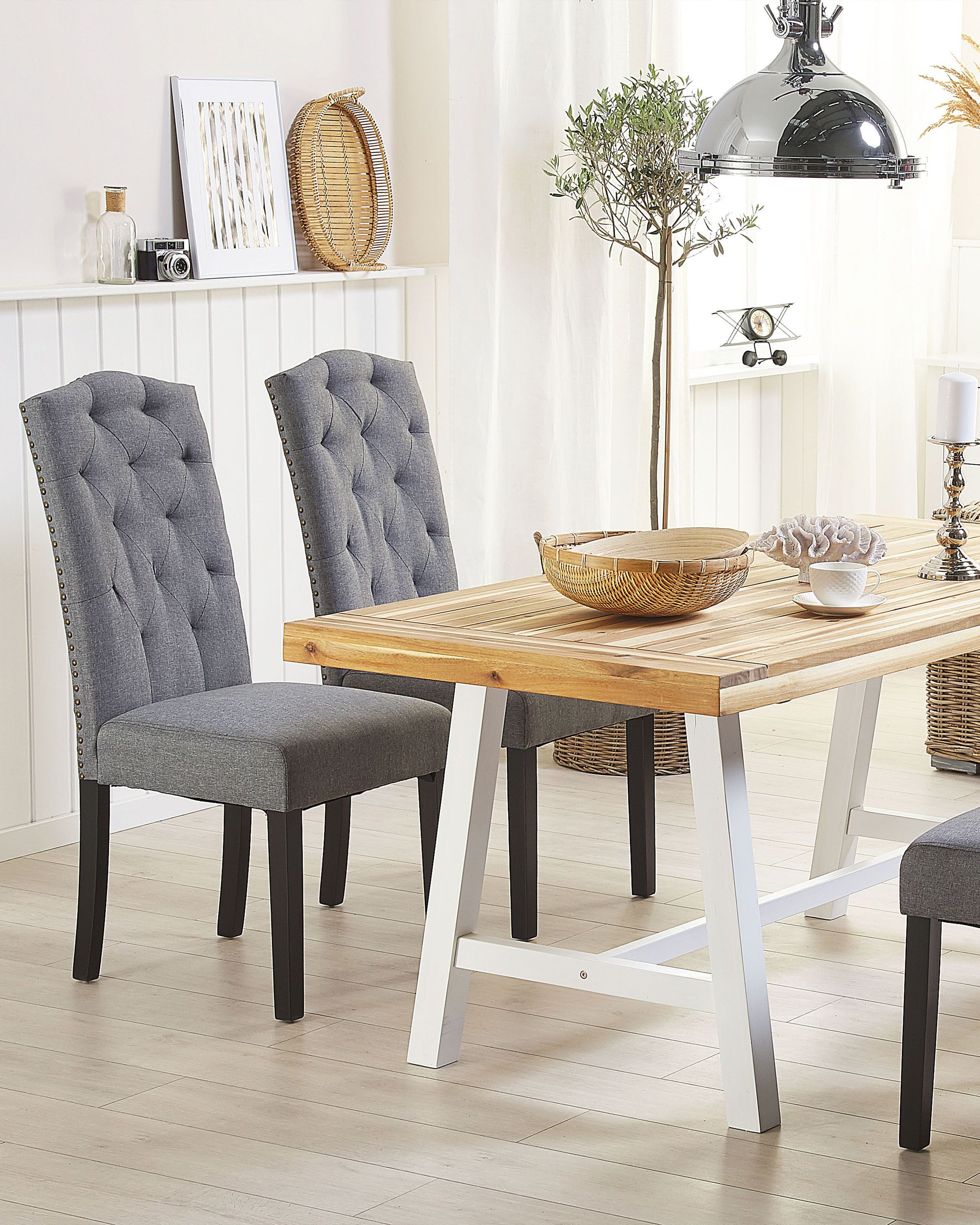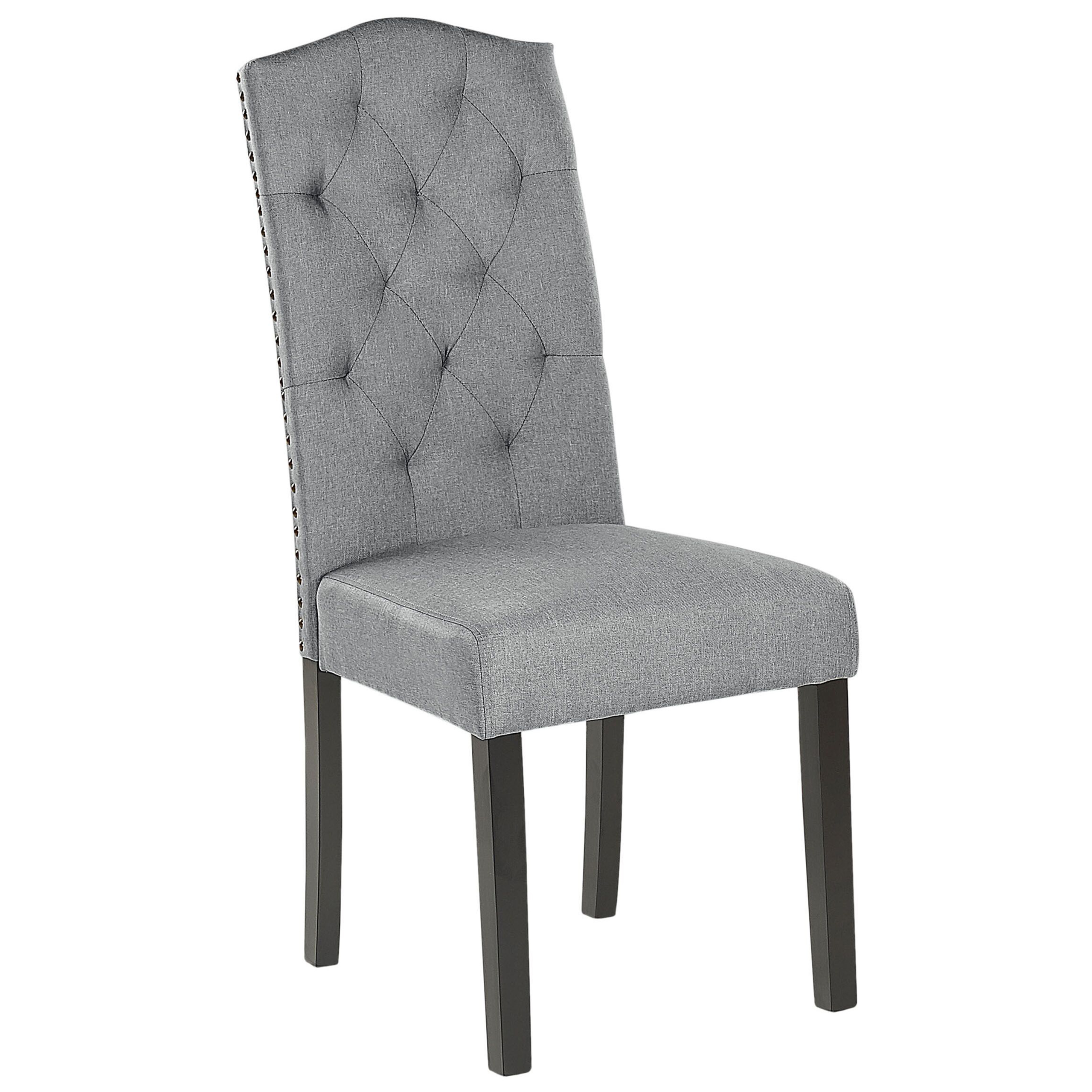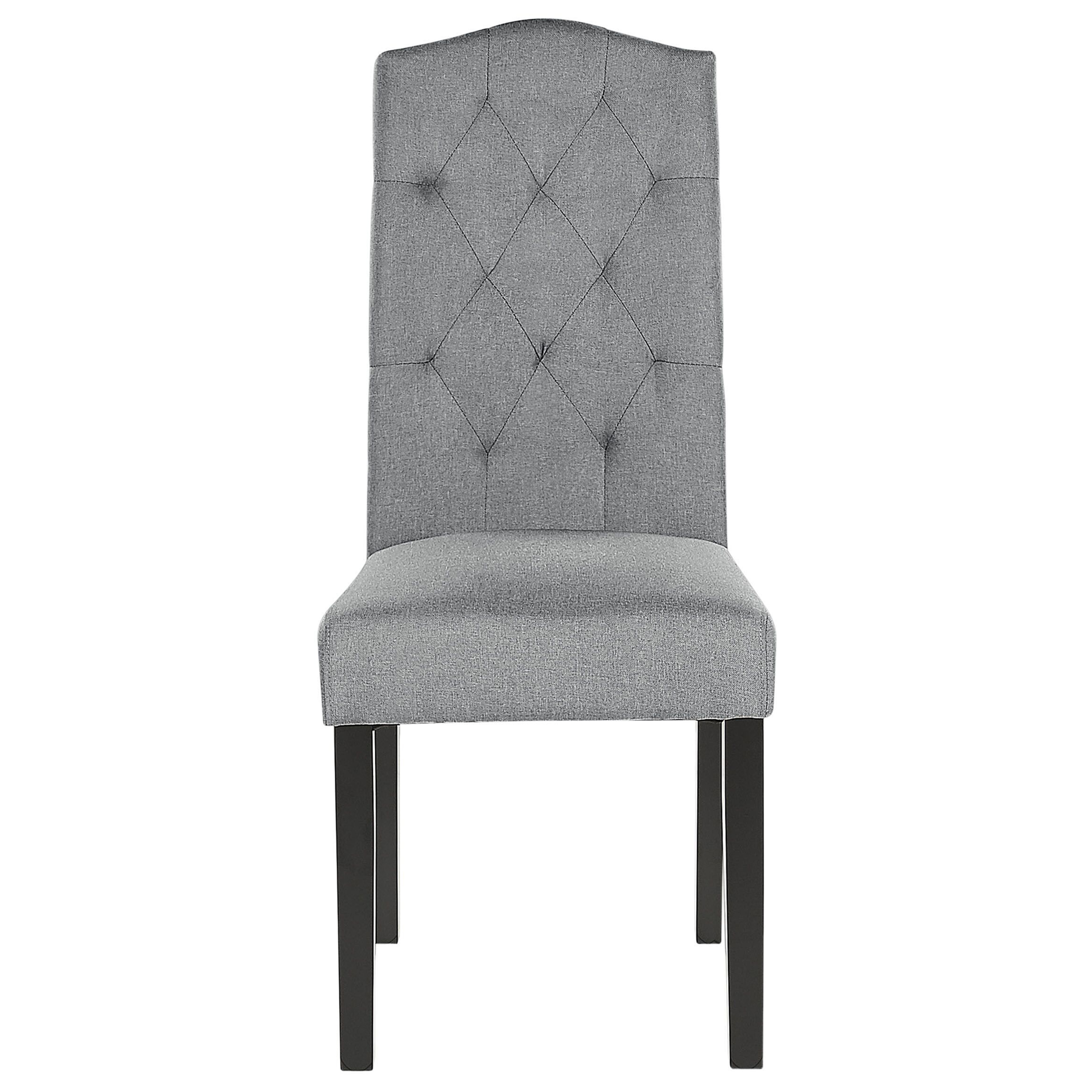 Lot de 2 chaises de salle à manger élégantes en tissu capitonné gris . Ces chaises glamours et très confortables vont faire sensation dans votre salle à manger ! Avec leur design d'inspiration Chesterfield et leurs pieds noirs, elles s'intègrent ainsi aisément dans chaque salle à manger, salon, chambre ou tout autre recoin de la maison. Le rembourrage en tissu gris donne à ce lot de deux chaises une note chic et une assise extrêmement confortable. Elles ont été pensées pour vous faciliter la vie avec leurs protections aux pieds pour ne pas rayer vos sols.