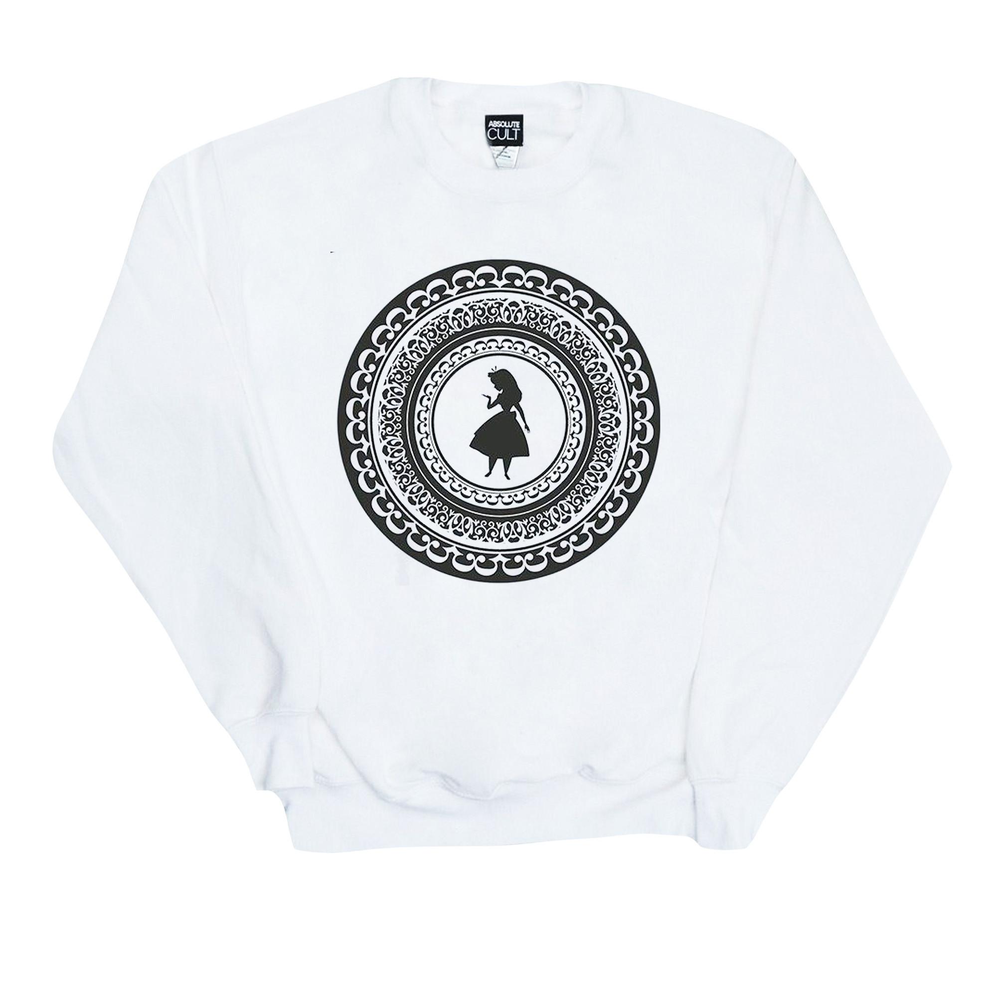 Ce sweat-shirt présente un col rond classique et des manches longues, offrant un ajout confortable et polyvalent à toute garde-robe. Le devant est orné d'un imprimé graphique distinctif, mettant en valeur une silhouette d'Alice du film Alice au Pays des Merveilles de Disney dans un cadre circulaire orné.
