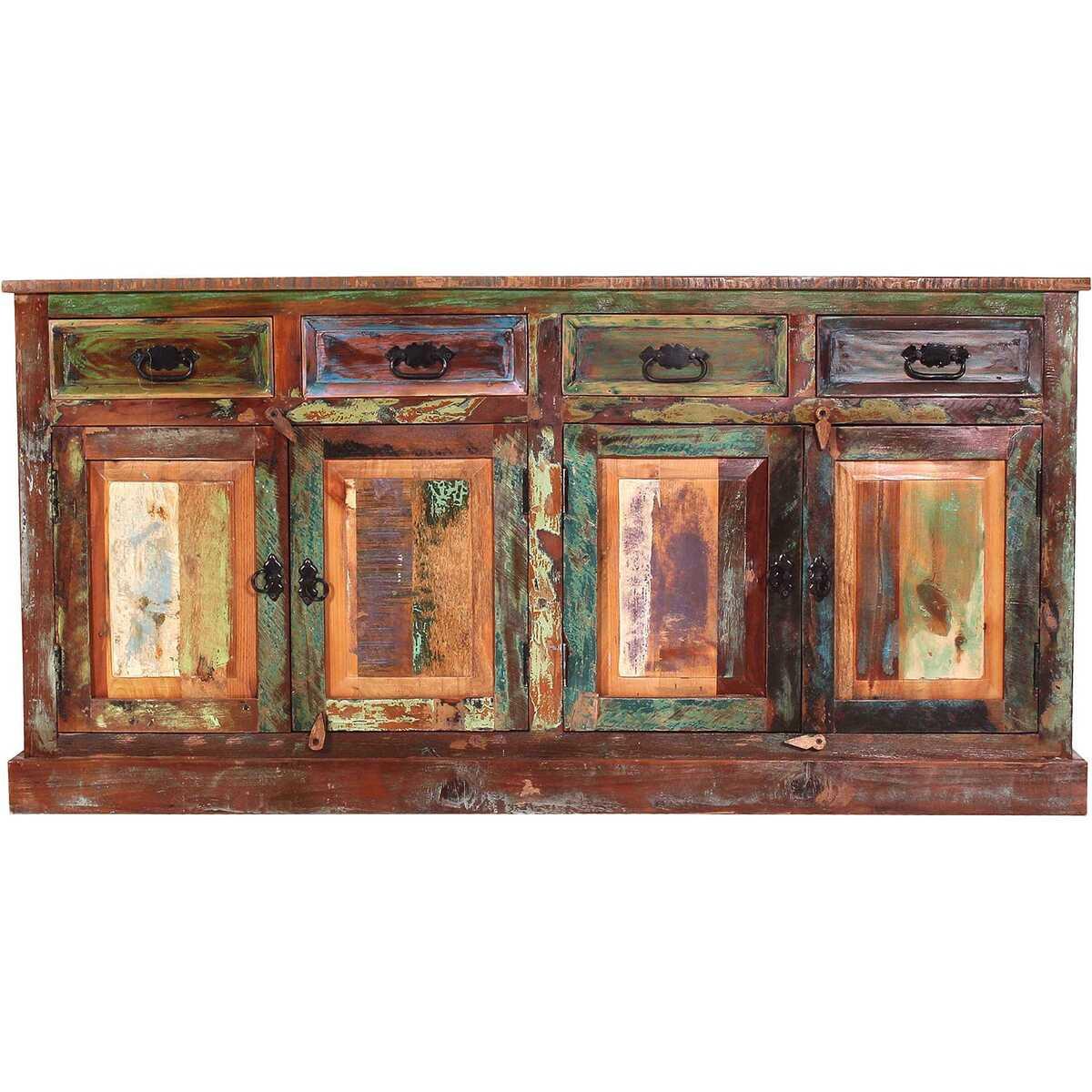 Description de l'objet :Ce grand sideboard en vieux bois coloré de style shabby chic est un véritable accroche-regard. Il est polyvalent grâce à sa possibilité de combinaison avec le mobilier déjà existant. Le buffet offre suffisamment de place dans 4 tiroirs et derrière 4 portes opaques avec chacune une étagère fixe pour les affaires privées de la vie. Le plateau supérieur convient également pour des vases ou des coupes plus grands. Dans l'entrée, comme armoire de vestiaire supplémentaire, il offre beaucoup d'espace de rangement. Le bois provenant de bateaux de pêche recyclés donne à la commode un charme supplémentaire. La commode peut aussi bien être associée à un mobilier moderne dans un salon ou une salle à manger que révéler son charme dans un vestibule en tant qu'armoire vestiaire. Loin de notre perfection souvent ennuyeuse, ce meuble est une véritable pièce unique.Composition : 4 portes, 4 tiroirsInformations complémentaires : 1 fond derrière les portes
