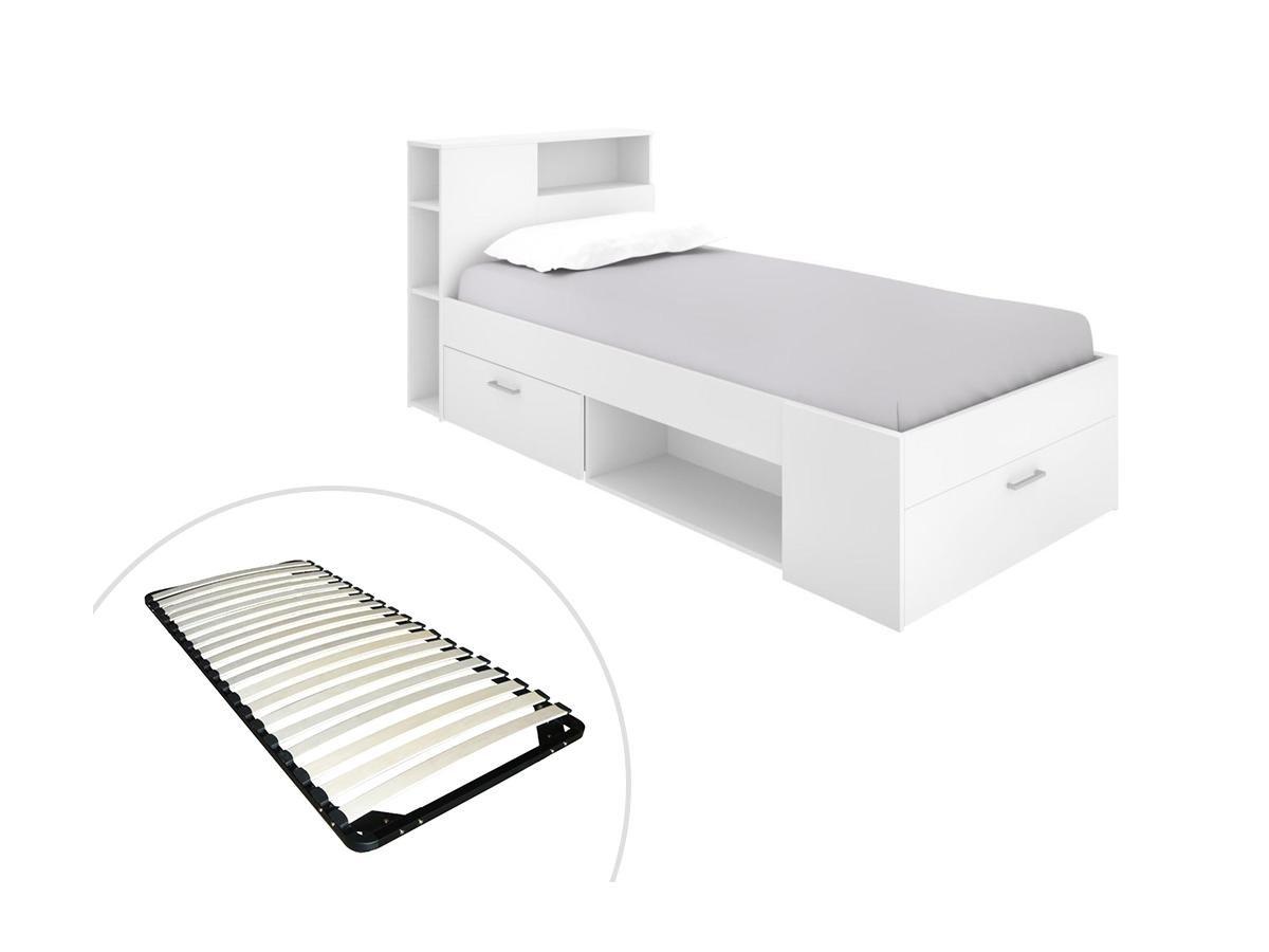 Vente-unique Lit avec tête de lit rangements et tiroir - 90 x 190 cm - Blanc + Sommier - LEANDRE