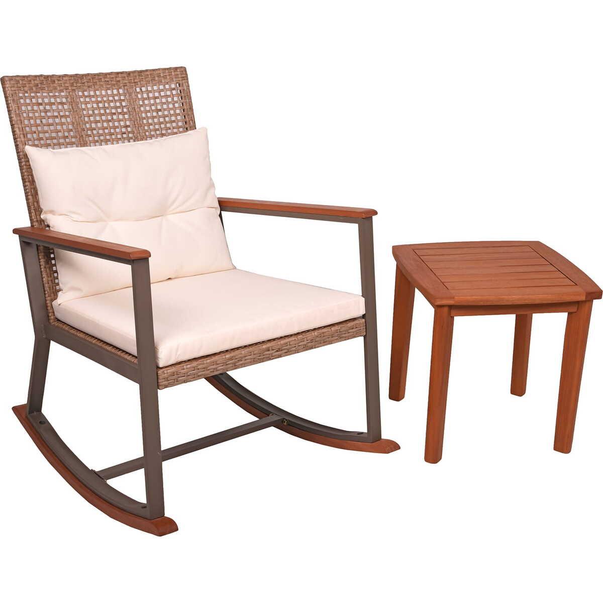 Comprend un fauteuil à bascule et une table d'appoint. Fabriqué en bois d'eucalyptus huilé à l'aspect teck Fauteuil à bascule avec tressage synthétique robuste Revêtement confortable en beige pour un grand confort d'assise La table d'appoint offre un espace de rangement pratique Capacité de charge maximale de 110 kg Hauteur du dossier : 55 cm Accoudoirs pour un confort supplémentaire