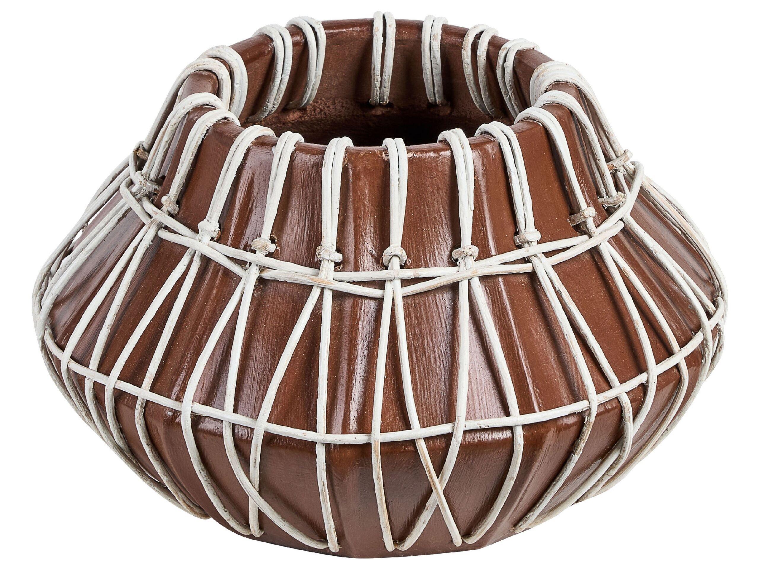 Récipient en terre cuite. Un vase en terre cuite fabriqué à la main sera le complément parfait d'une décoration intérieure moderne. Sa forme unique, soulignée par un tressage en rotin, attire l'attention par son style naturel. Les couleurs de la terre et les matériaux écologiques créent un vase unique qui s'intégrera parfaitement dans les intérieurs boho et japonais.