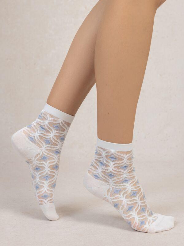 Ces chaussettes rétro transparentes présentent un motif délicat et complexe qui ajoute une touche d'élégance à toute tenue. Le design combine une base transparente avec un motif décoratif opaque, créant un look élégant et unique. Les chaussettes sont dotées d'un revers confortable à la cheville.
