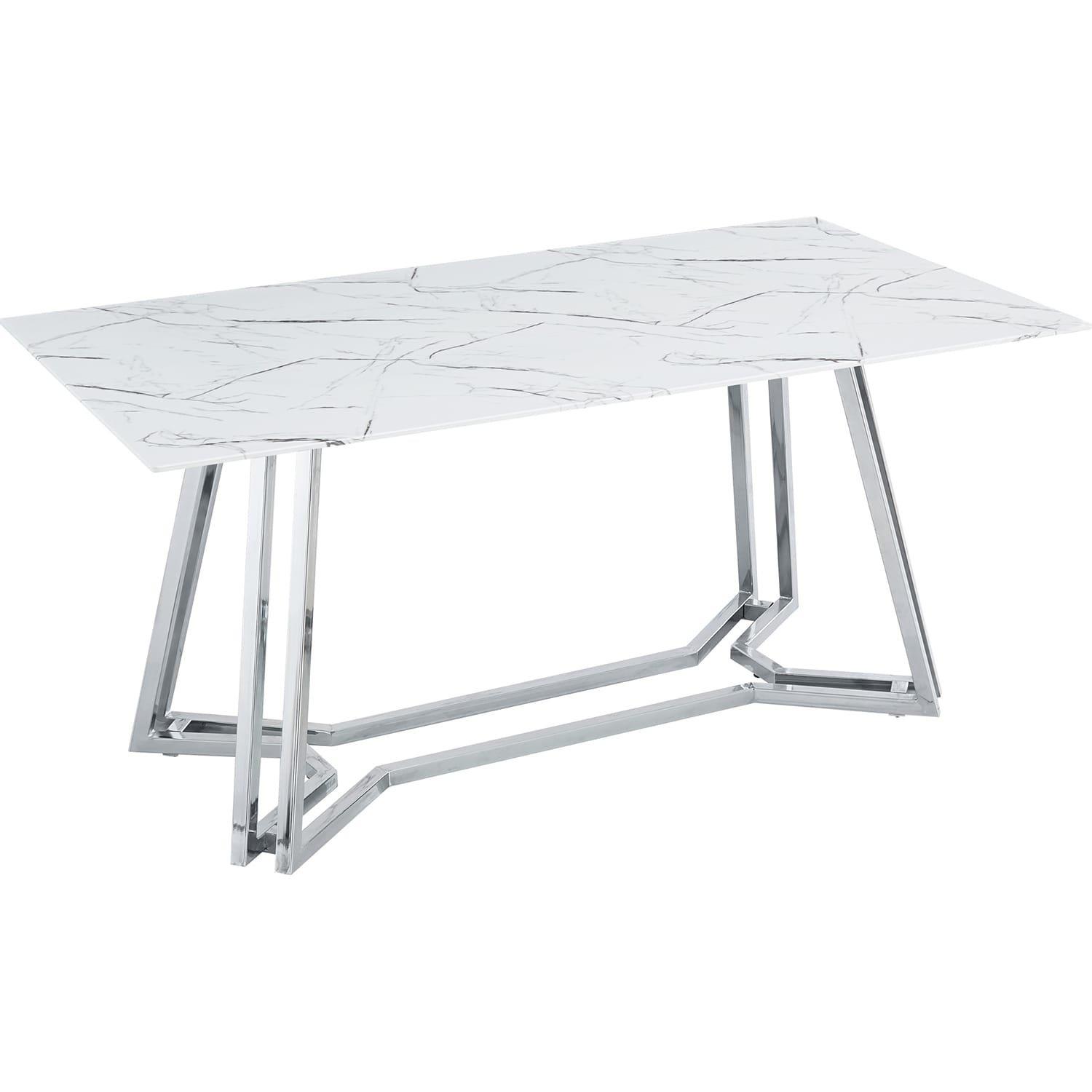 Cette table de salle à manger est la nouvelle pièce maîtresse de votre salle à manger. Le plateau de table blanc à l'aspect marbré est fabriqué en verre. Le piètement métallique en couleur chrome n'est pas seulement élégant, il confère également à la table une très bonne stabilité. Les meubles à l'aspect marbre sont très tendance et s'intègrent dans presque tous les intérieurs. Cette table de salle à manger ne se contente pas d'accueillir les repas quotidiens. Elle permet d'organiser de longues discussions avec des amis, la famille ou des partenaires commerciaux.Plateau de table en verre trempé de 10 mm (verre de sécurité), cadre chromé, charge maximale : partie centrale 120 kg, côtés 30 kg, hauteur du bord inférieur de la table env. 74 cm.design exceptionnelsurface facile à entretenirplateau de table en aspect marbrestabilité grâce au cadre métalliqueplace pour jusqu'à 6 personnesplateau de table en optique marbre, piétement chromé