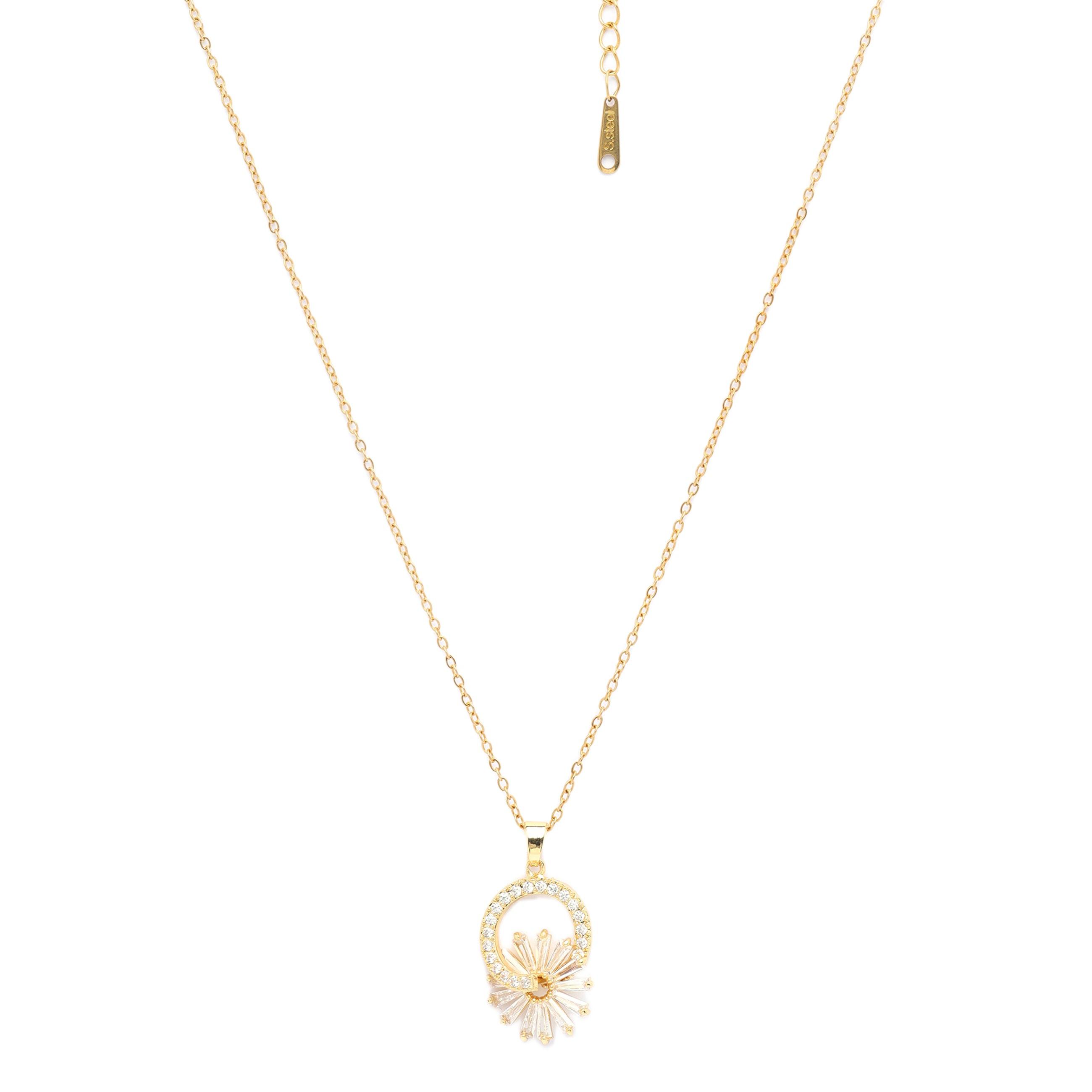 Rayonnez de charme et de sophistication avec ce collier éblouissant. Son design circulaire est orné de pierres scintillantes, entourant un motif soleil captivant qui rayonne de chaleur et d'éclat. La finition dorée apporte une touche de luxe, faisant de ce collier le choix idéal pour les occasions spéciales comme pour une allure glamour au quotidien. Que ce soit pour une soirée ou pour ajouter une touche lumineuse à votre tenue de tous les jours, ce collier vous assurera une élégance intemporelle. Dimensions : 1,5 cm x 2,1 cm | Placage : Plaqué or | Fermoir : Mousqueton