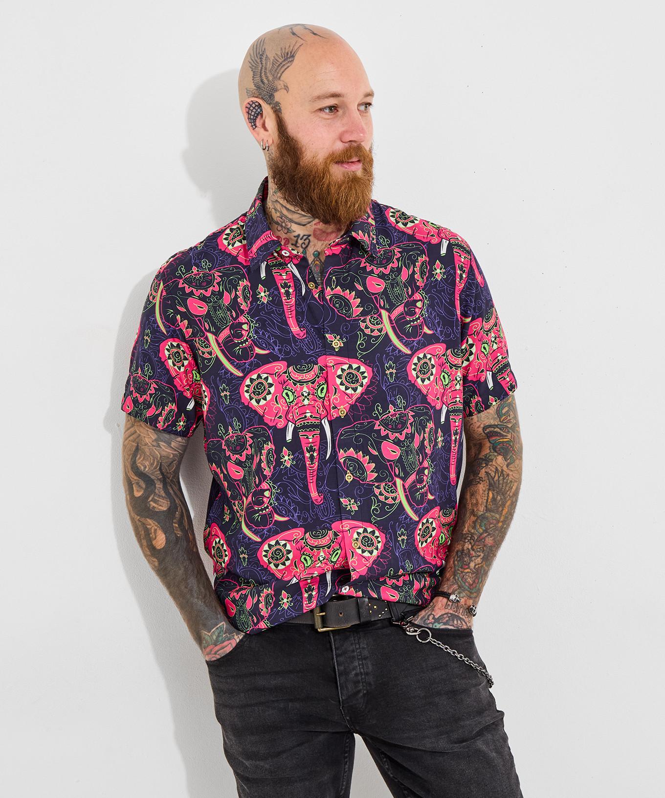 Cette chemise à manches courtes avec un motif d'éléphant vif est un ajout distinctif à toute garde-robe. Le design accrocheur ajoute une touche ludique à une silhouette classique.
