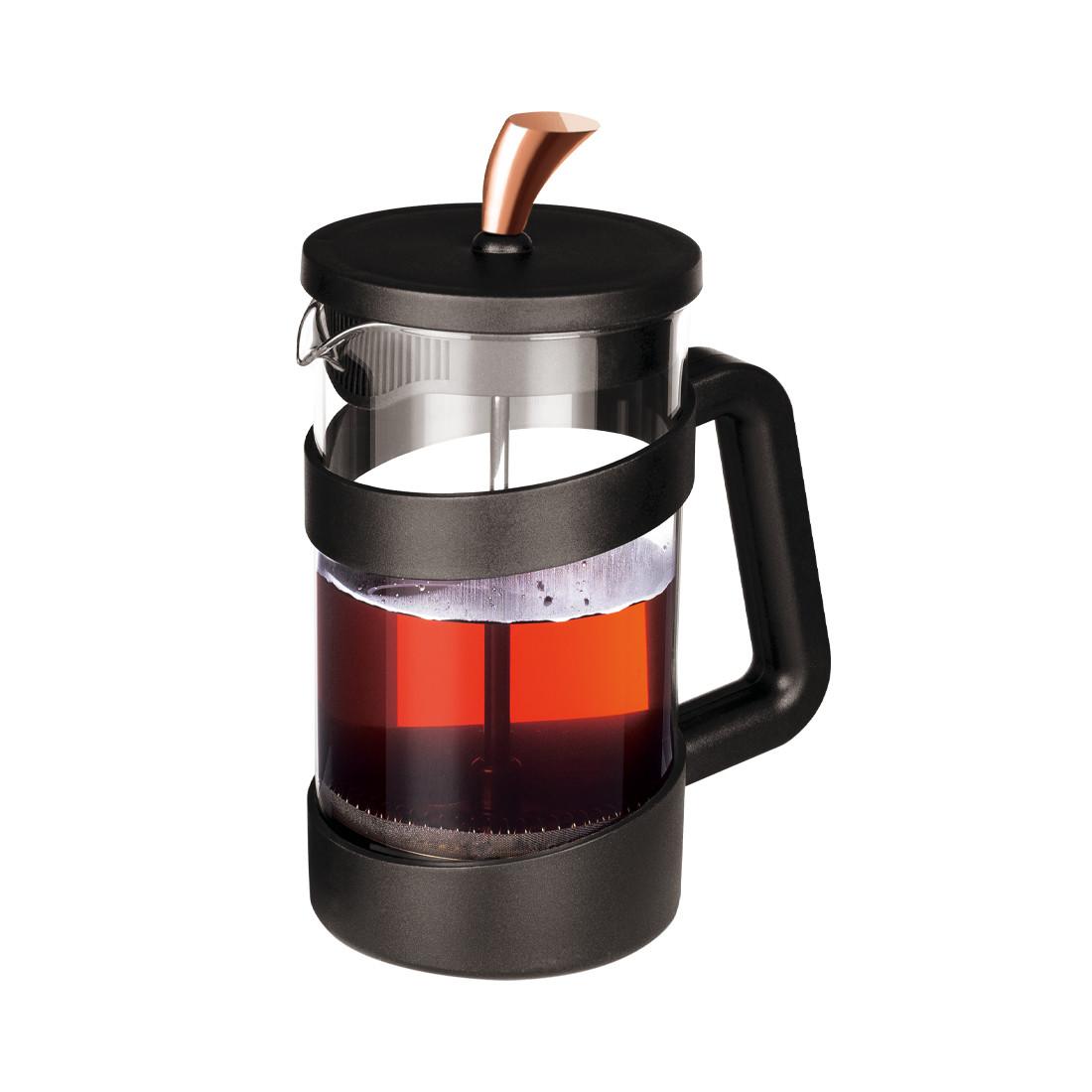 Informations sur le produit :, Distributeur de café et de thé, En acier inoxydable, Avec couvercle en plastique , En verre borosilicaté, Capacité 1000 ml, Noir avec détails rose-doré, Résistant à la chaleur jusqu'à 180°C, Fond antidérapant en silicone, Facile à utiliser et à nettoyer, Stylé et pratique