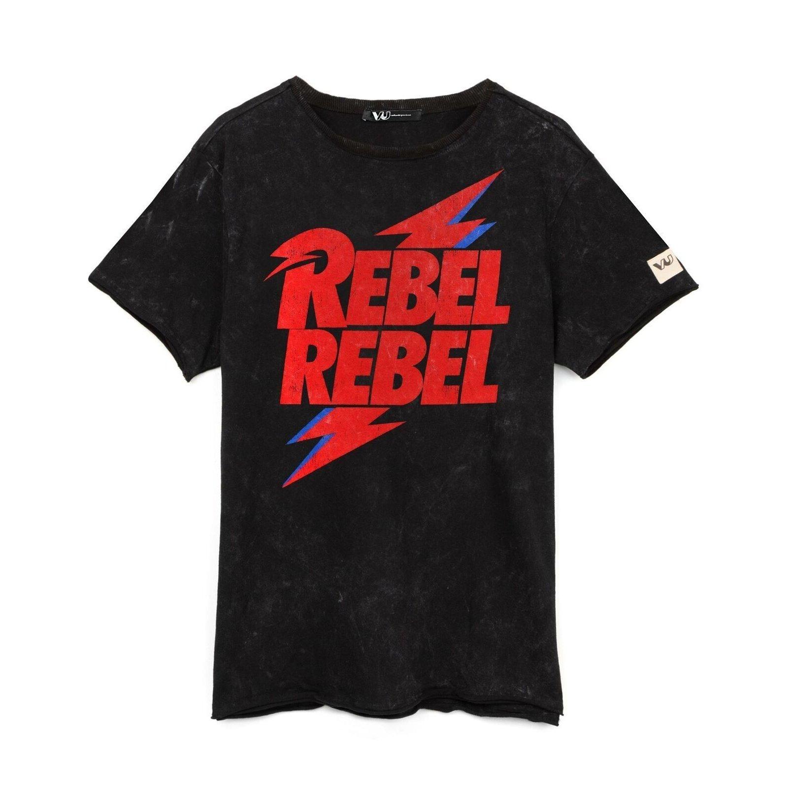 Ce T-shirt arbore un imprimé graphique audacieux "Rebel Rebel" sur le devant, faisant une déclaration forte. Le design est complété par des motifs d'éclairs, ajoutant une touche edgy à l'ensemble. Le T-shirt a un col rond classique et des manches courtes, offrant une coupe confortable et polyvalente pour un usage quotidien.