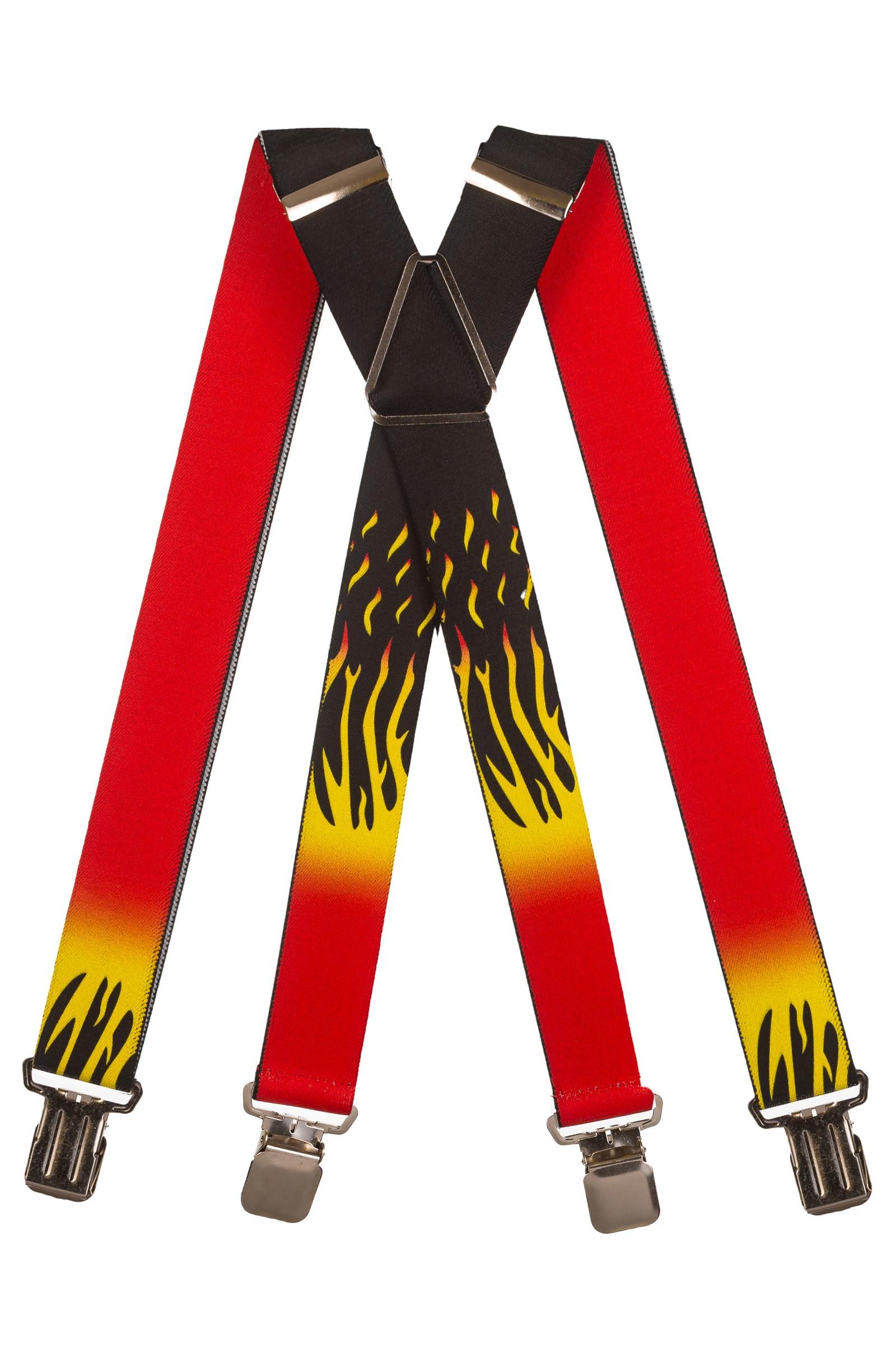 Ces bretelles durables sont disponibles en forme de X et de Y pour des tailles allant jusqu'à 1,94 m. Elles sont réglables en longueur et comportent des lanières de 4 cm de large. Les bretelles élastiques sont ornées d'un motif de flamme inhabituel et comprennent une pièce transversale renforcée en cuir ainsi que des clips métalliques robustes pour un maintien supplémentaire.