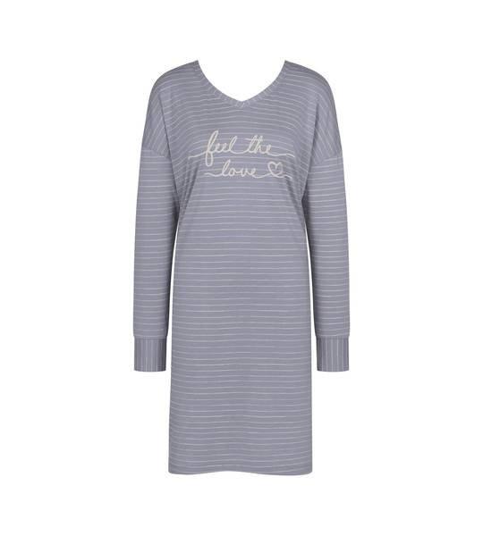 Cette chemise de nuit décontractée offre une coupe confortable, parfaite pour les soirées de détente. Le design présente un col en V et des manches longues, procurant une sensation de confort. Le devant est orné d'un charmant imprimé "feel the love", ajoutant une touche de douceur à ce vêtement de nuit.