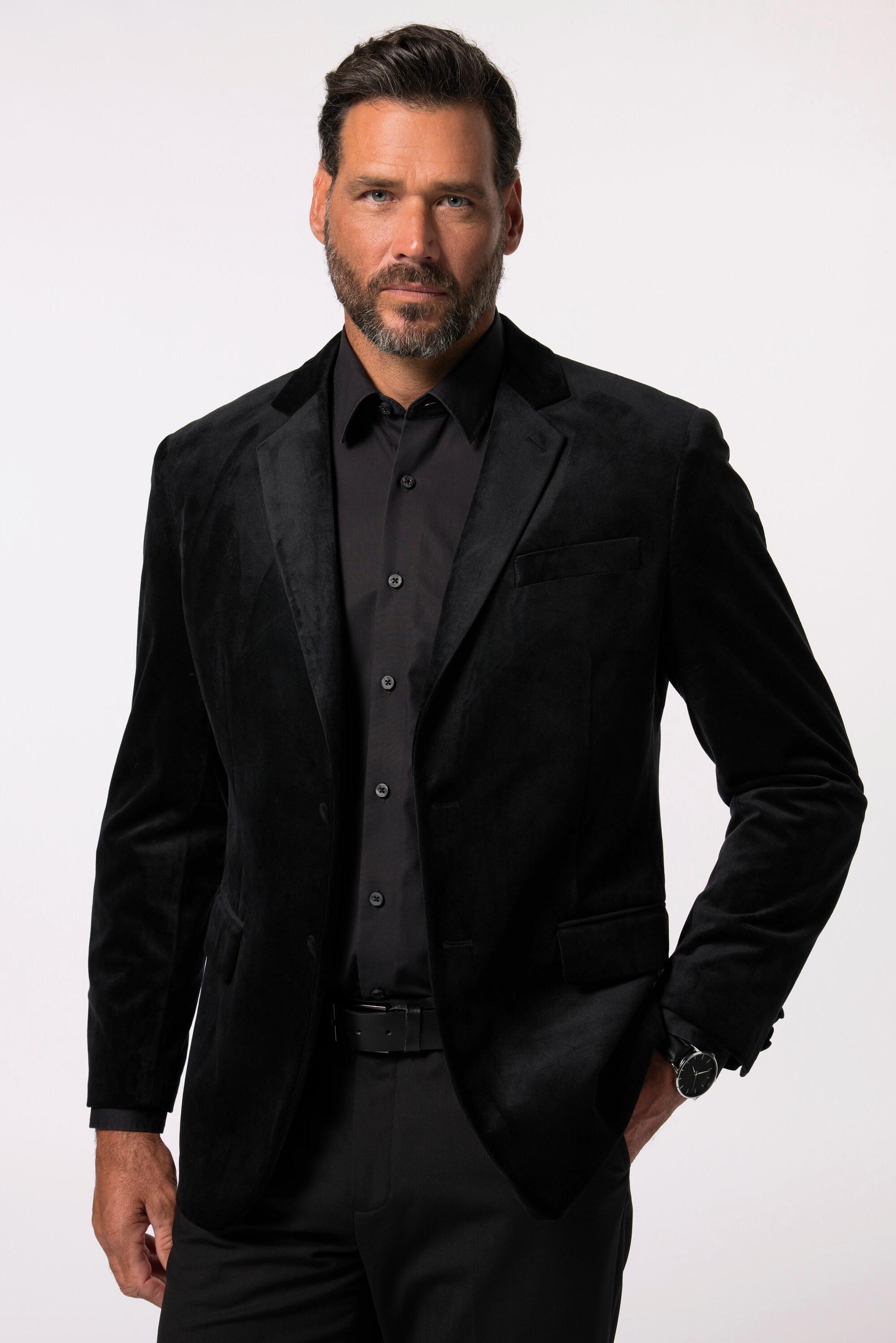 Ce veston en velours offre un look sophistiqué pour les occasions formelles. Il présente un col à revers classique et une fermeture boutonnée sécurisée, ce qui en fait un ajout polyvalent à toute garde-robe. La coupe spéciale est disponible jusqu'à la taille 74.