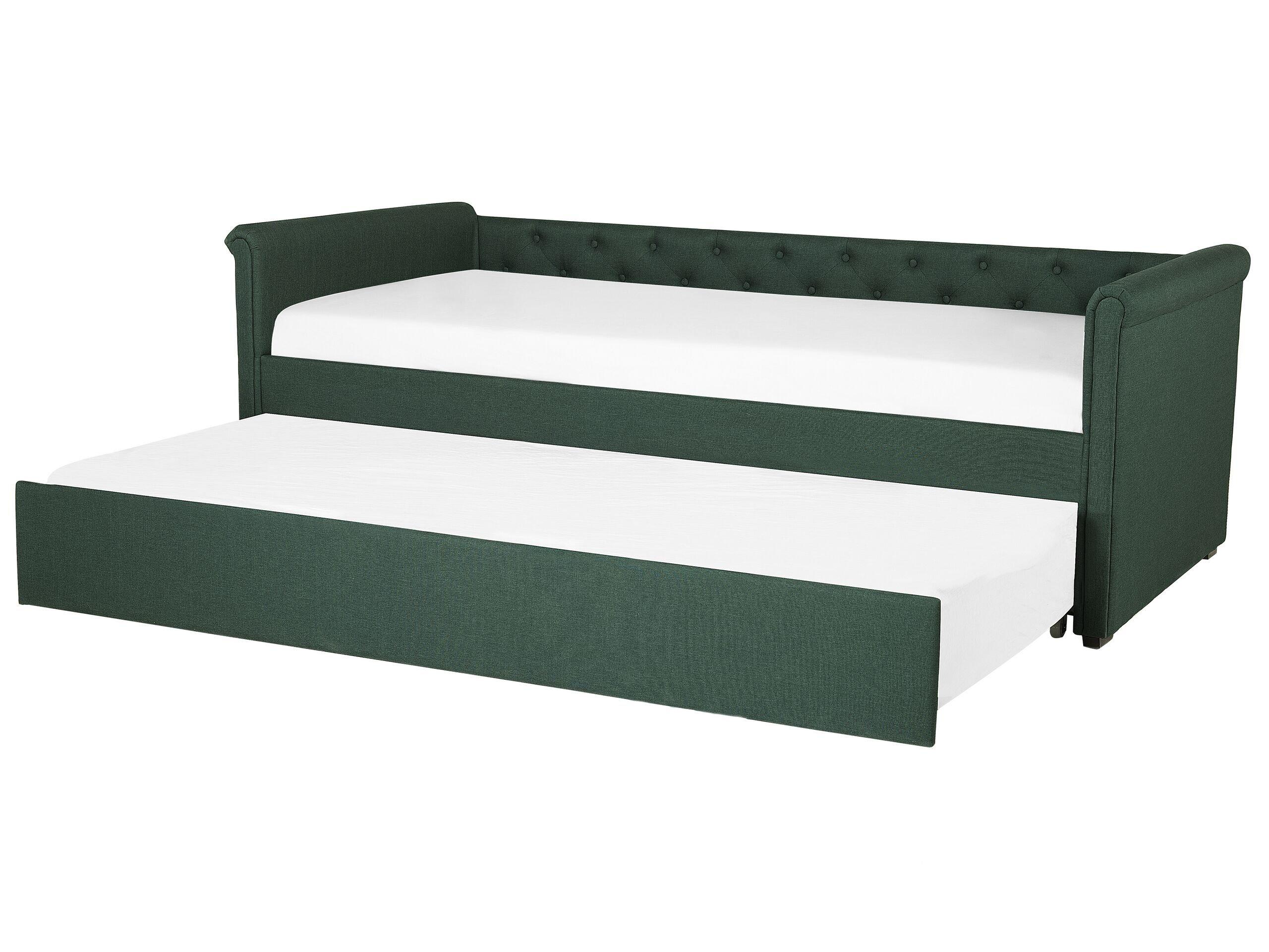 Lit avec tiroir. Inspiré par la forme de lit chesterfield, ce lit gigogne mélange à la fois la fonctionnalité et le style. Recouvert d'un revêtement en polyester doux au toucher, le lit présente une touffe de boutons décorative de style vintage qui le rend parfait pour les intérieurs rétro et traditionnel. Le lit comprend un sommier à lattes qui permet une distribution uniforme du poids du corps sur toute la surface, ce qui contribue grandement à assurer un sommeil sain et non perturbé. Le lit peut fournir une surface de couchage supplémentaire et constitue est une solution pratique dans la chambre damis ou celle des enfants.