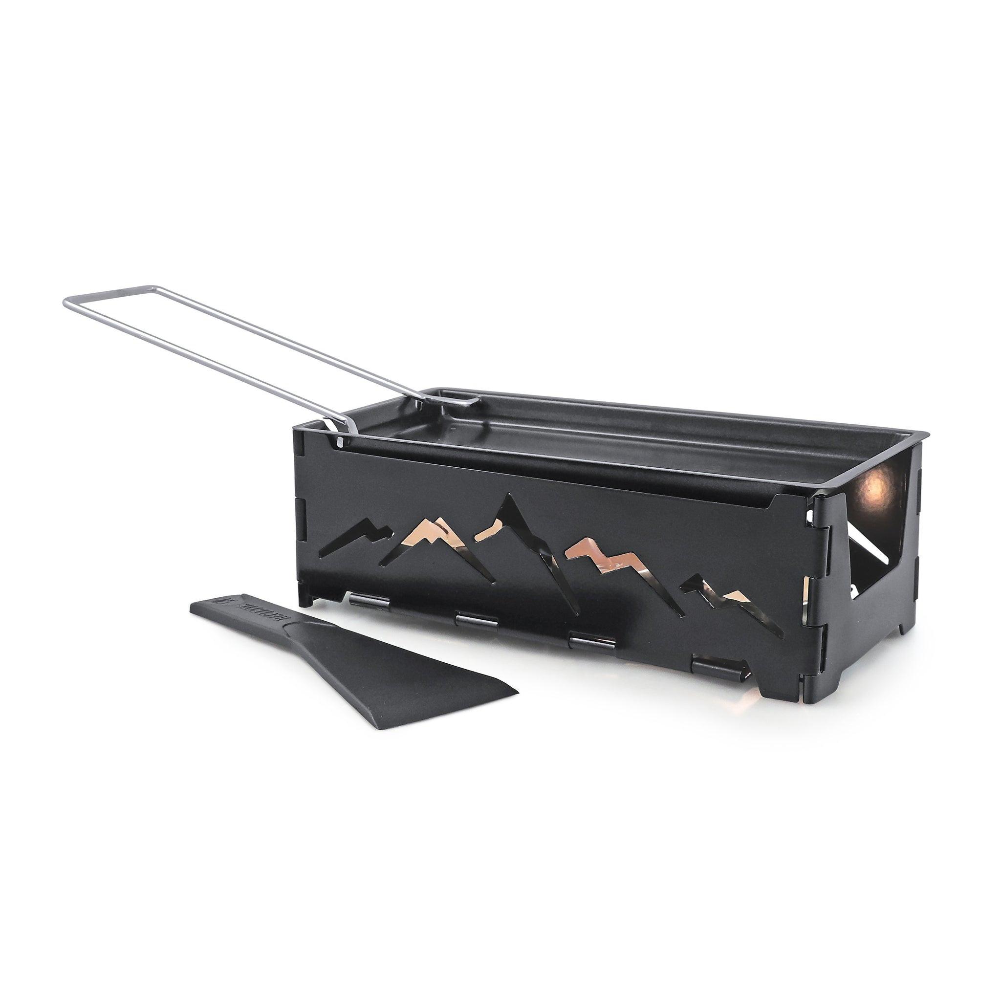 En acier, pliable, avec 1 poêle à raclette avec revêtement antiadhésif, 1 spatule en plastique résistant à la chaleur, 3 bougies réchaud