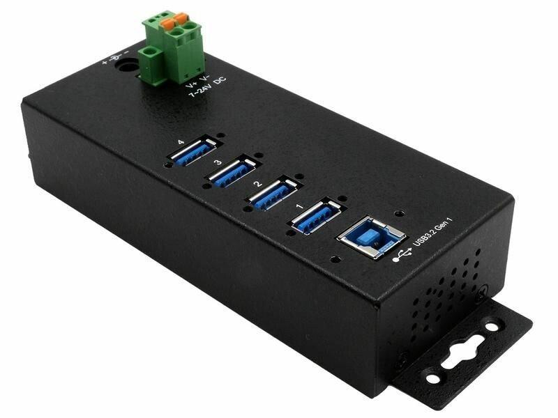 Alimentation : Bloc dalimentation, Bloc terminal, USB, Nombre de ports : 4, Couleur détaillée : Noir, Standard USB : 3.0/3.1/3.2 Gen 1 (5 Gbps), Connexion USB 2 (Appareil) : USB A, Connexion USB 1 (Source) : USB BBoîtier en métal pour montage mural ou en rack (y compris kit DIN-Rail)Connexions en aval : 4x USB 3.0 Type-AAlimentation : Bus-Powered ou Self-Powered (via bloc terminal)Protection ESD 15 kV, Température dutilisation 0-55 °C1x Indicateur de tension LEDConnexion en amont : USB 3.0 Type-BContenu de la livraison :EX-1185HMVS-2Câble USB 3.0 (1,5 m)Kit Din-RailManuel