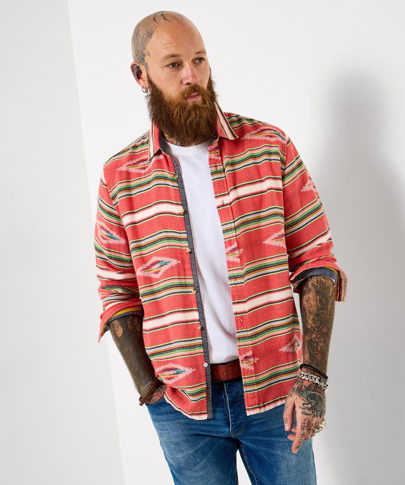 Overshirt homme audacieux, rayures acid-wash et motifs Aztec, détails chambray, léger et parfait pour superpositions printanières.