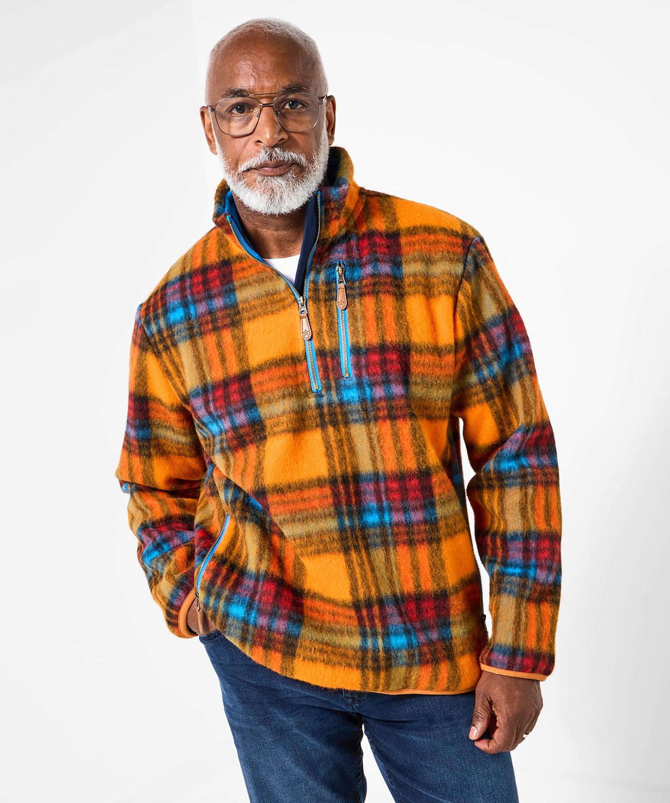 Ce haut en mélange de laine à carreaux est doté d'un col cheminée et d'une fermeture éclair quart, offrant à la fois chaleur et style. Le motif à carreaux vif en fait un ajout distinctif à toute garde-robe.