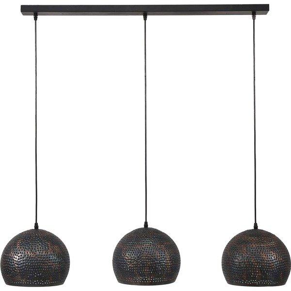 Cette suspension à 3 lumières est en métal et disponible en noir / marron. Les stores sphériques ont des trous de perforation à travers lesquels la lumière brille magnifiquement. Le plafonnier a la même couleur noir / marron que les écrans.