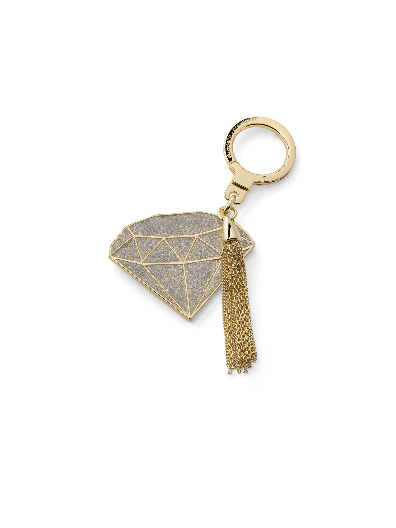 Ce porte-clés élégant est doté d'un charm en forme de diamant avec une surface texturée étincelante et un cadre doré poli. Un délicat pompon en chaîne de couleur or assortie ajoute une touche de sophistication. Le porte-clés est équipé d'un fermoir sécurisé, ce qui en fait un accessoire élégant pour les clés ou les sacs.