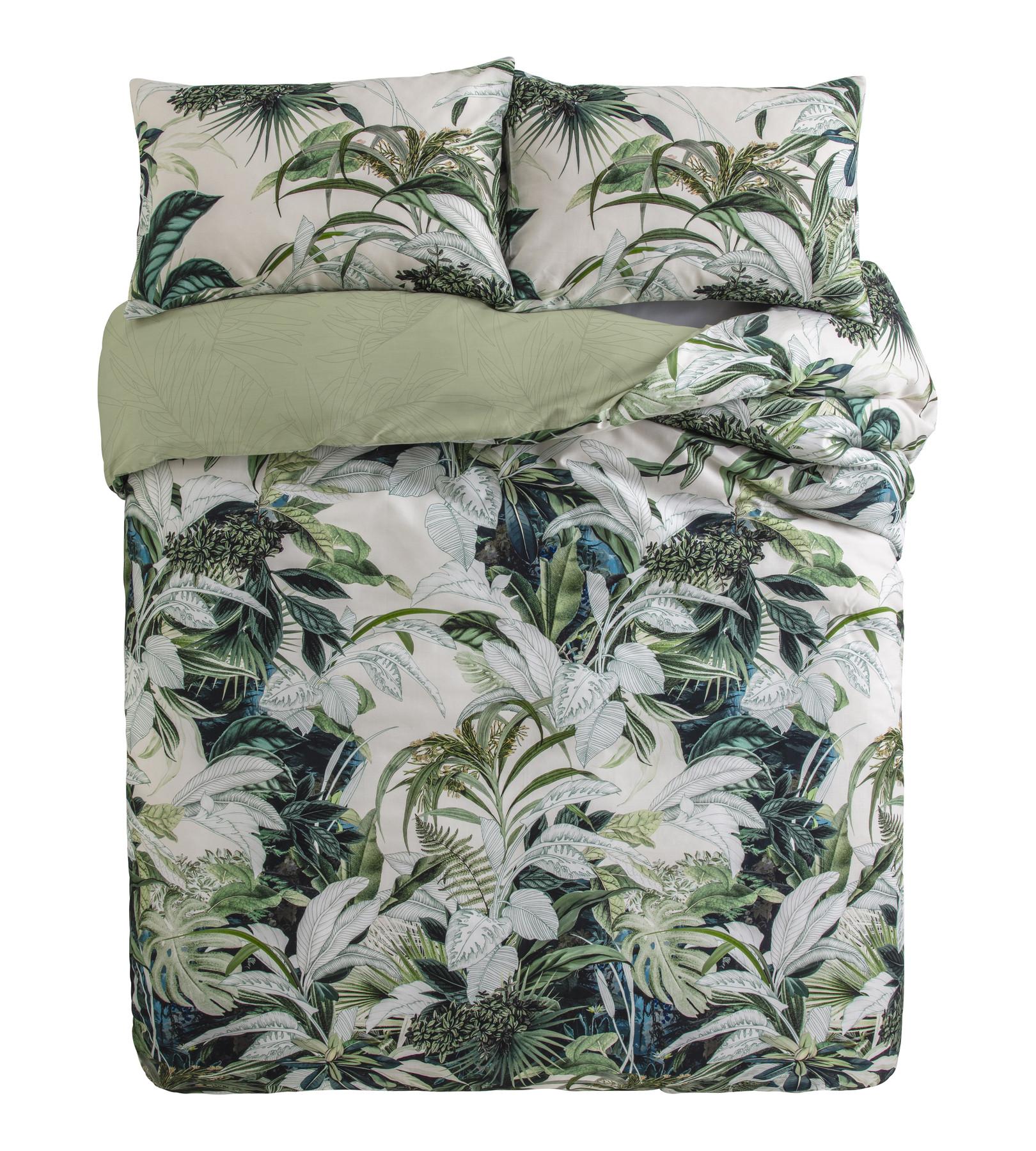 La housse de couette Aruba présente un imprimé de feuilles tropicales éclatant, apportant une esthétique rafraîchissante et naturelle à toute chambre à coucher. Le design met en valeur une variété de feuillages verts sur un fond clair, créant une atmosphère sereine et invitante. Le revers de la housse de couette est d'un vert clair uni, offrant une option de style polyvalente.