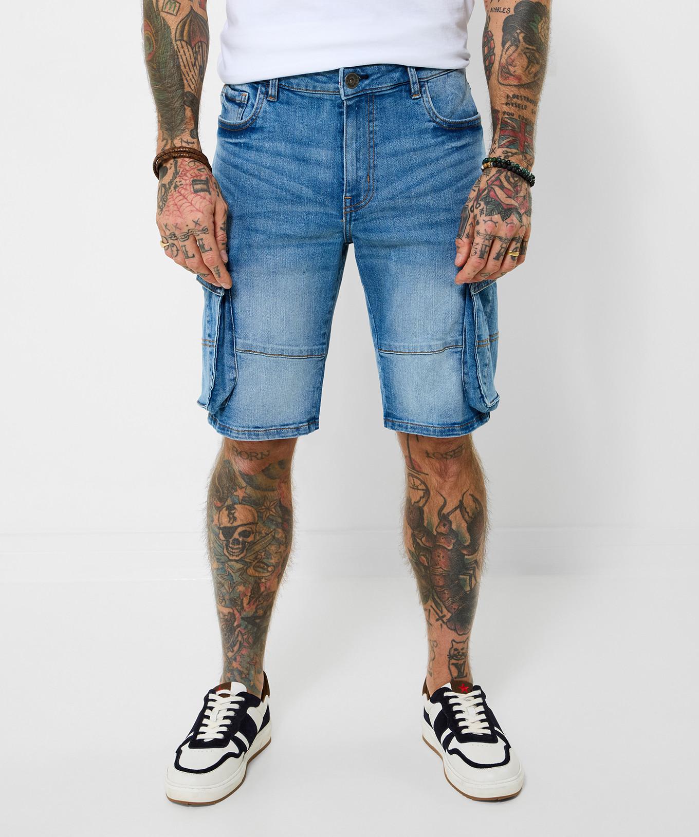 Short cargo en denim mid-wash avec confort stretch. Idéal pour plage, BBQ ou journées casual.