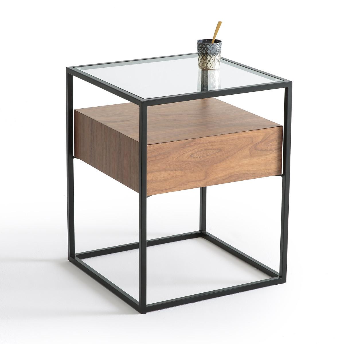 Le chevet 1 tiroir Agura.Un style chic et très contemporain.On aime l'association réussie du métal, du bois et du verre, et la qualité de ses finitions.