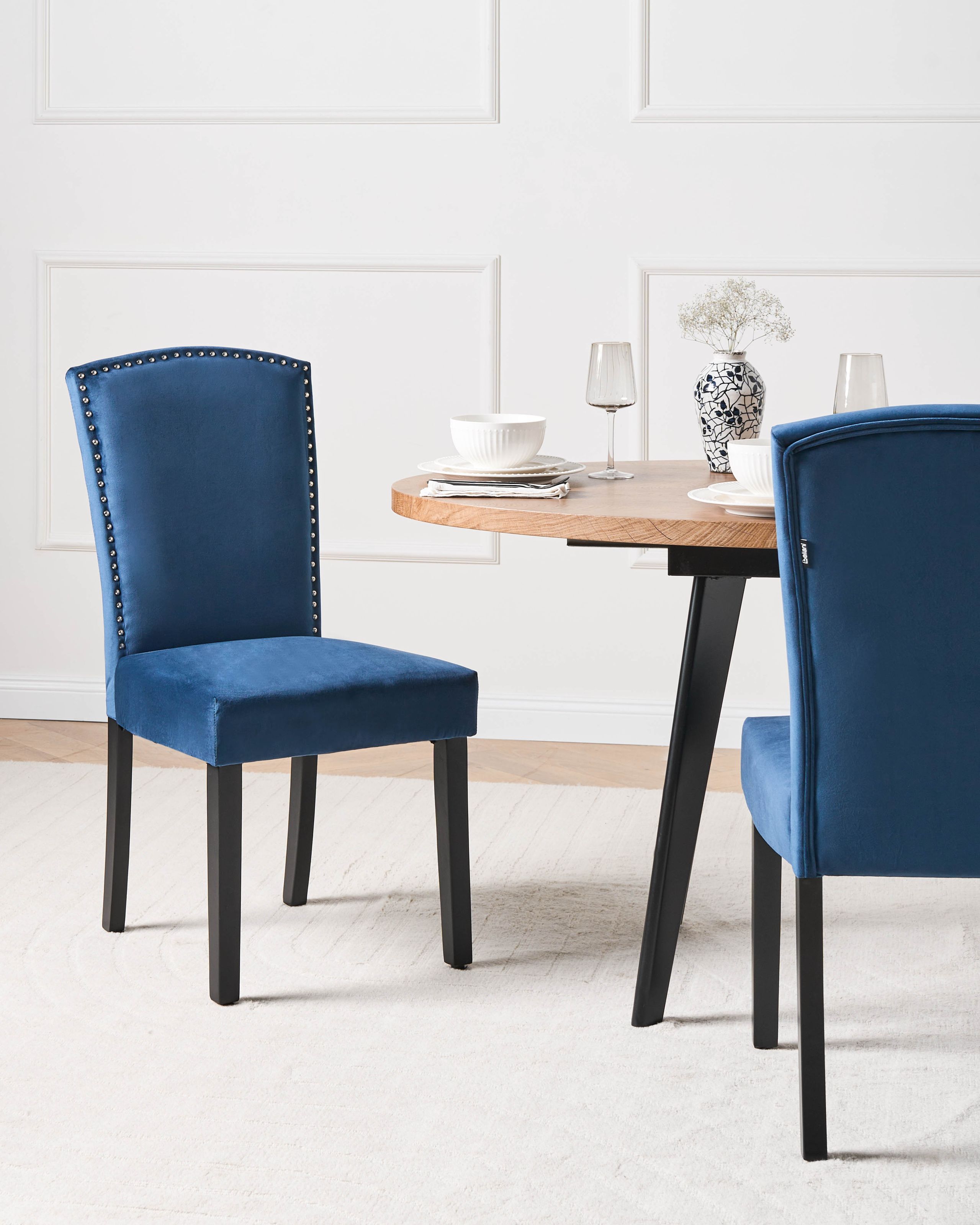 Lot de 2 chaises de salle à manger glamour en velours avec rivets métal. Un ensemble de deux chaises en velours dont le charme rétro vous enchantera immédiatement ! Ces sièges confortables ravissent avec leurs revêtements en velours doux et leurs couleurs vives. Les deux dossiers élégants reçoivent un look particulièrement glamour et classe grâce à la subtile bordure décorative de rivets en métal. L'ensemble se marie parfaitement avec n'importe quelle table et chacune des chaises aura également fière allure sur une commode ou une coiffeuse. Les pieds robustes en bois de pin offrent la stabilité nécessaire et les capuchons de protection supplémentaires aident à protéger votre sol.