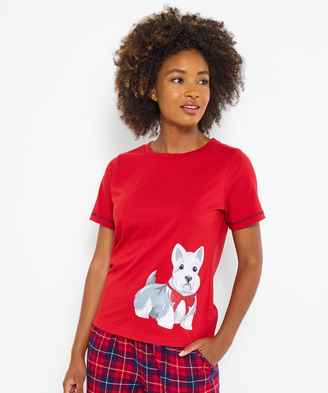 Cet ensemble de pyjama d'hiver présente un design charmant, parfait pour des nuits confortables. Le haut est un t-shirt à manches courtes avec un col rond, orné d'un joli motif de chien sur le devant. Le pantalon est conçu avec un motif à carreaux classique, offrant une coupe décontractée pour une facilité de mouvement.