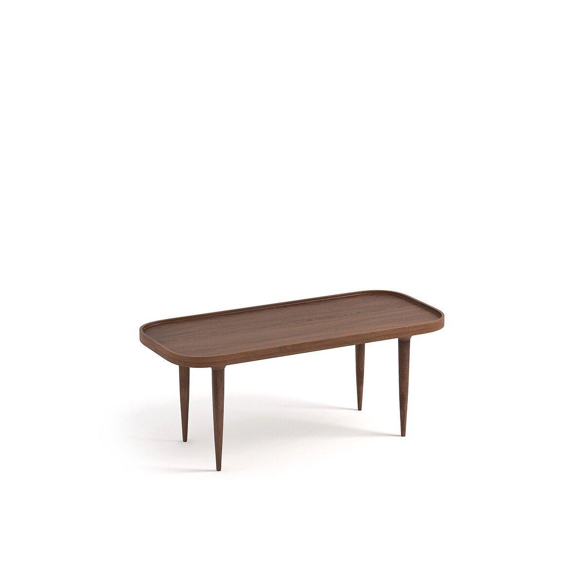 La table basse Magosia. Pieds stiletto, fin plateau et réalisation en noyer massif, cette longue table basse étroite sera parfaite devant votre canapé ou à utiliser en table gigogne avec la table basse grande taille Magosia vendue sur le site.