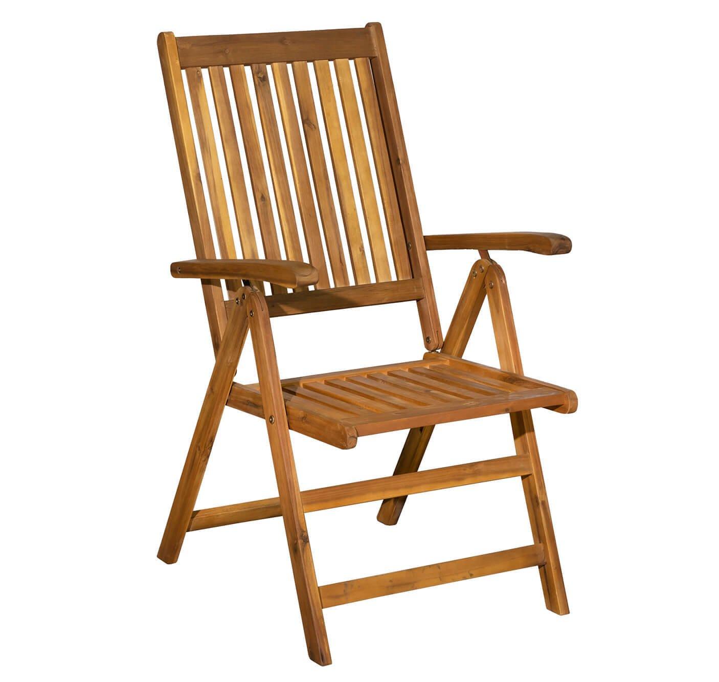 avec accoudoirs, dossier réglable en 5 positions, pliable, hauteur du dossier : environ 59 cm, hauteur d'assise : environ 44 cm, largeur d'assise : environ 47 cm, profondeur d'assise : environ 49 cm, capacité de charge maximale : env. 120 kg, surface en bois d'acacia huilé