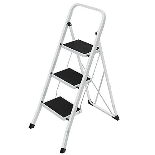 Spécifications : - Couleur : Blanc - Matériau : Acier - Capacité de charge maximale : 150 kg - Taille pliée : 46,5 x 4,5 x 117 cm (L x P x H) - Poids : 5,5 kg Contenu de l'emballage : - 1 x escabeau - 1 x Mode d'emploi (EN, DE, FR, ES, IT)