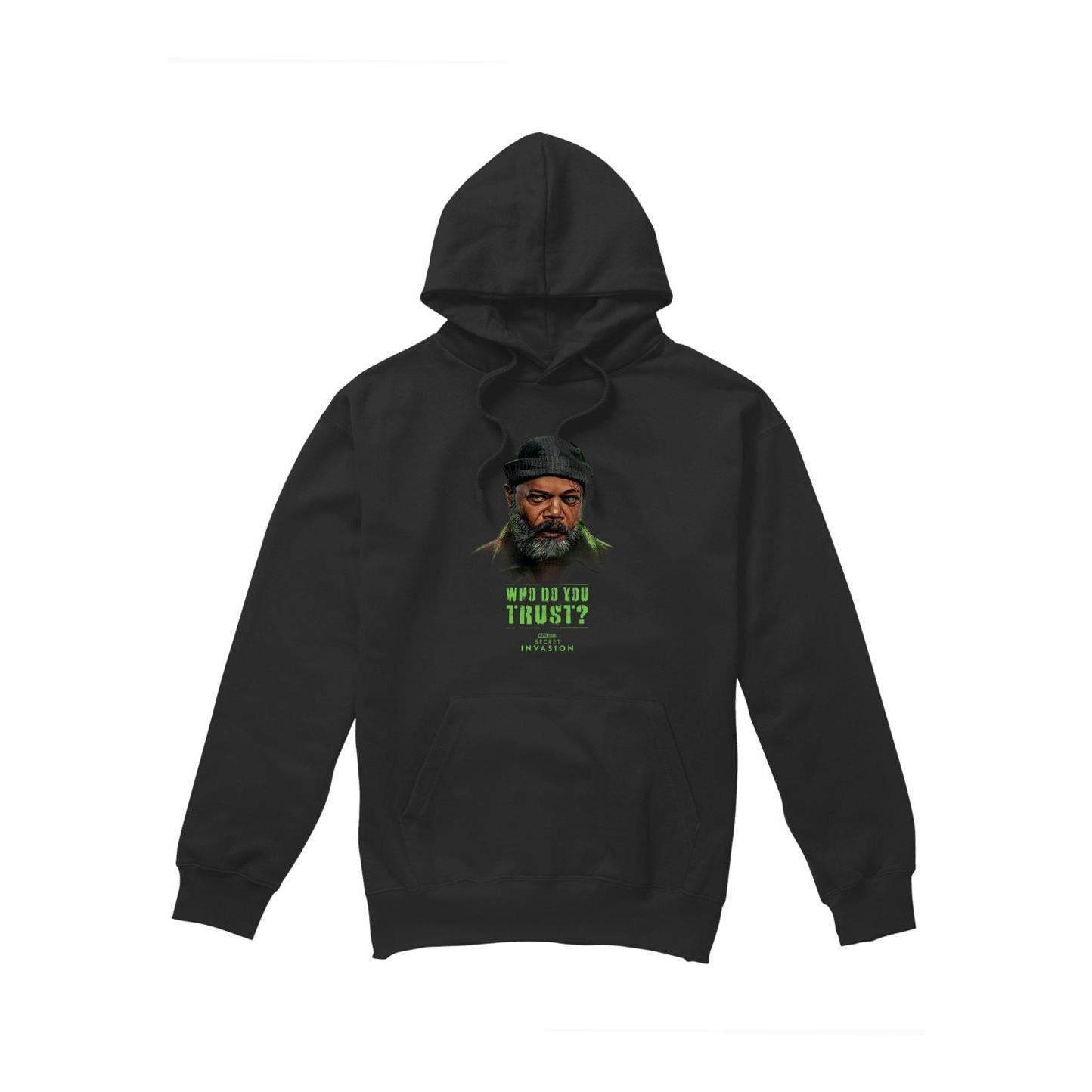 Ce sweat à capuche présente un imprimé graphique saisissant sur le devant, mettant en scène un personnage de la série avec le texte « WHO DO YOU TRUST? » et « MARVEL STUDIOS SECRET INVASION ». Le sweat à capuche comprend une capuche à cordon de serrage et une poche kangourou, offrant à la fois confort et style décontracté.