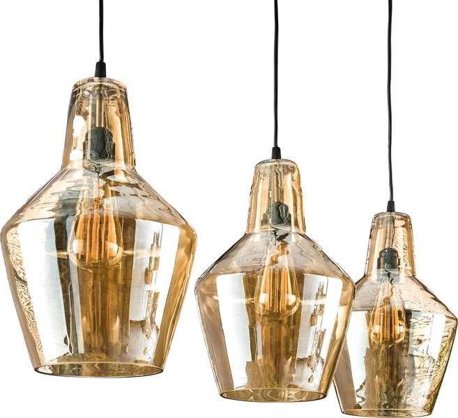 Suspension 3 lumières cône en verre vieil argent, cône en verre ambre, 150x112x25 cm
