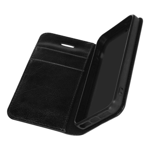 Etui portefeuille en cuir grainé pour [device_name] Revêtement en Cuir véritable avec finition surpiquée Fentes de rangement et pochette latérale découpés à l'intérieur du clapet Fonction support horizontal pour regarder vos vidéos avec les mains libres