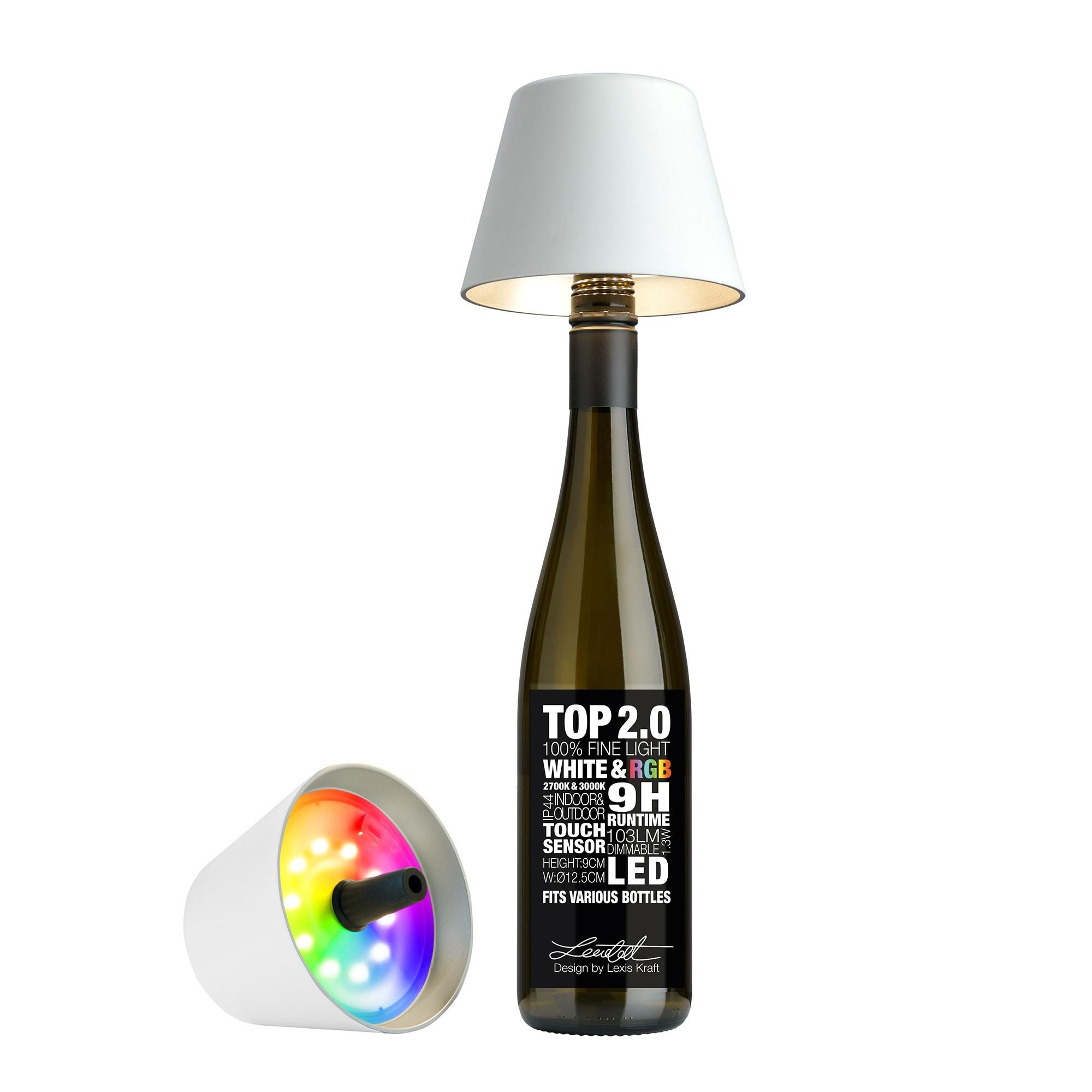 Lampe rechargeable Top 2.0 de Sompex, transforme presque n'importe quelle bouteille vide en une lampe de table.Disponible en 14 couleurs .La lampe avec bouchon en silicone s'adapte à presque toutes les bouteillesLe bouchon en silicone est apte au contact alimentaire, il peut donc être utilisé être utilisé sur des bouteilles vides et pleinesGrâce au variateur, l'ambiance est toujours parfaite .IP44 : le top peut donc être utilisé à l'intérieur et à l'extérieur. utiliser9 heures d'autonomie .Lumière blanc chaud ou blanc froid12 couleurs RGBUn emballage élégant, comme on n'en voit que sur des bouteilles nobles.Diamètre 12,5 cm .Le design est breveté dans toute l'EuropeDesigné par Lexis Kraft*Toutes les bouteilles sont utilisées uniquement à des fins à titre d'illustration et ne font pas partie de la livraison.Vous conservez une bouteille de champagne en tant que un anniversaire ou une simple bouteille de bière parce qu'elle a été elle a été vidée lors d'une fête inoubliable ? Ce verre usagé peut être se transforme désormais en un objet lumineux très spécial' avec la Lampe bouteille TOP 2.0 de Sompex ! Son bouchon en silicone s'adapte avec sa forme conique dans différents goulots de bouteilles'. en un tour de main un éclairage stylé avec un look unique. Devenez votre propre designer, optez pour l'upcycling dans toute sa splendeur. sa meilleure forme ! La lampe TOP 2.0 à intensité variable fonctionne sur batterie et fournit jusqu'à 40 heures de lumière aussi bien à l'intérieur qu'à l'extérieur. La TOP 2.0 est disponible en différentes couleurs et est livré dans un joli un emballage rond que l'on ne connaît que pour les bouteilles raffinées' un cadeau idéal. un cadeau parfait. Le capteur tactile de l'abat-jour en plastique permet de choisir permet de sélectionner trois modes d'éclairage différents : 1. température de couleur (sélection) : Dans ce mode, vous pouvez choisir entre les couleurs blanc chaud températures de couleur 2700K et 3000 K. Après avoir choisi la couleur souhaitée température de couleur, l'intensité lumineuse peut être réglée à l'aide de la touche capteur tactile pour le régler. 2. lumière colorée (sélection) : Dans ce mode, les mode, vous choisissez votre couleur de lumière préférée parmi 12. Les couleurs RGB suivantes sont disponibles au choix : Rouge, Rouge-Magenta, Magenta, Bleu-Magenta, Bleu, cyan-bleu, cyan, cyan-vert, vert-jaune, jaune, orange 3. Lumière colorée (mode automatique de 12 minutes) : Dans ce mode, les 12 couleurs RVB sont automatiquement en un changement de couleur de douze minutes. Le changement de couleur est continu et offre, grâce aux transitions douces (env. 30 secondes) une ambiance à la fois agréable et variée. Avec Fonction mémoire : le mode de couleur et la luminosité du luminaire pour bouteilles TOP 2.0 sont mémorisés. luminosité sont mémorisés. Vous démarrez ainsi confortablement avec le TOP 2.0 avec les avec les réglages que vous souhaitez.Le TOP est livré dans un joli emballage rond, que l'on ne connaît habituellement que pour les bouteilles raffinées - un cadeau parfait.