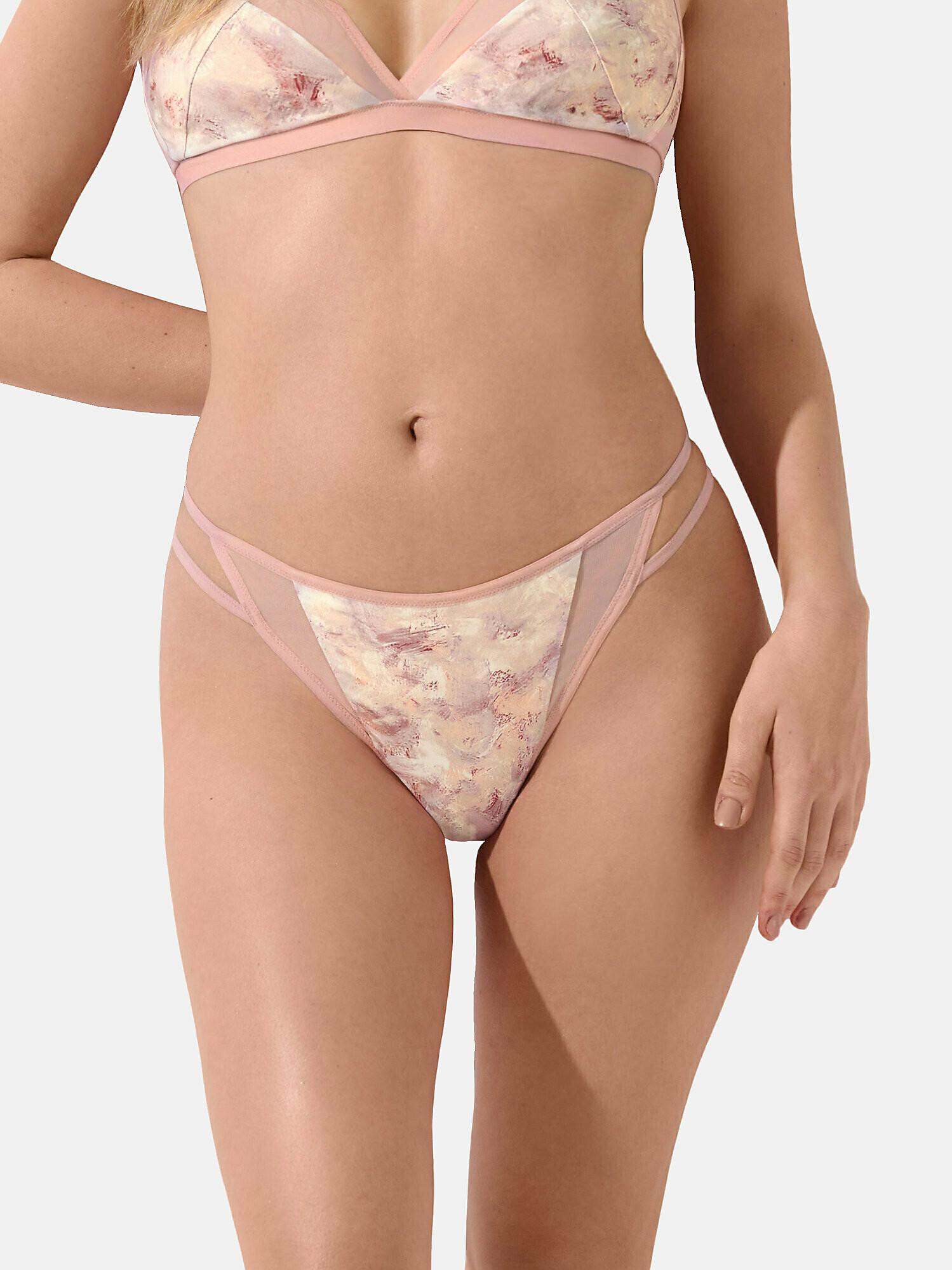 La collection Olena propose un string minimaliste à jambe haute qui allonge visuellement les jambes. Il combine un imprimé abstrait moderne avec du tulle, offrant un design confortable, léger et séduisant avec un détail moderne de deux élastiques. Un gousset en coton assure un confort intime.
