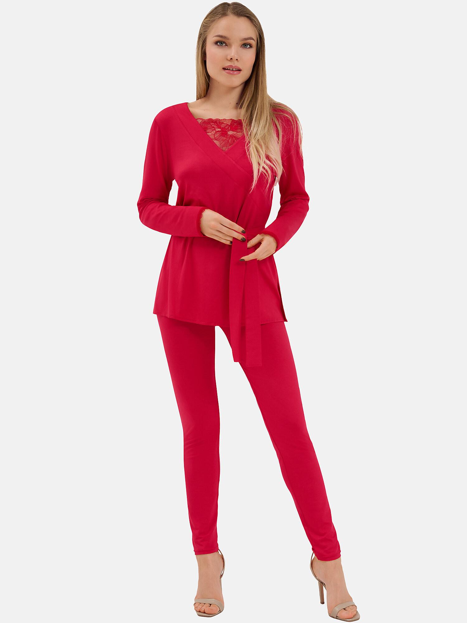 Cet ensemble de pyjama comprend une tunique à manches longues et des leggings assortis, offrant un look coordonné et confortable pour se détendre ou dormir. La tunique présente un décolleté en V avec de délicats détails en dentelle, ajoutant une touche d'élégance. Une ceinture à nouer à la taille permet un ajustement réglable, rehaussant la silhouette. Les leggings assortis offrent une coupe ajustée et confortable.