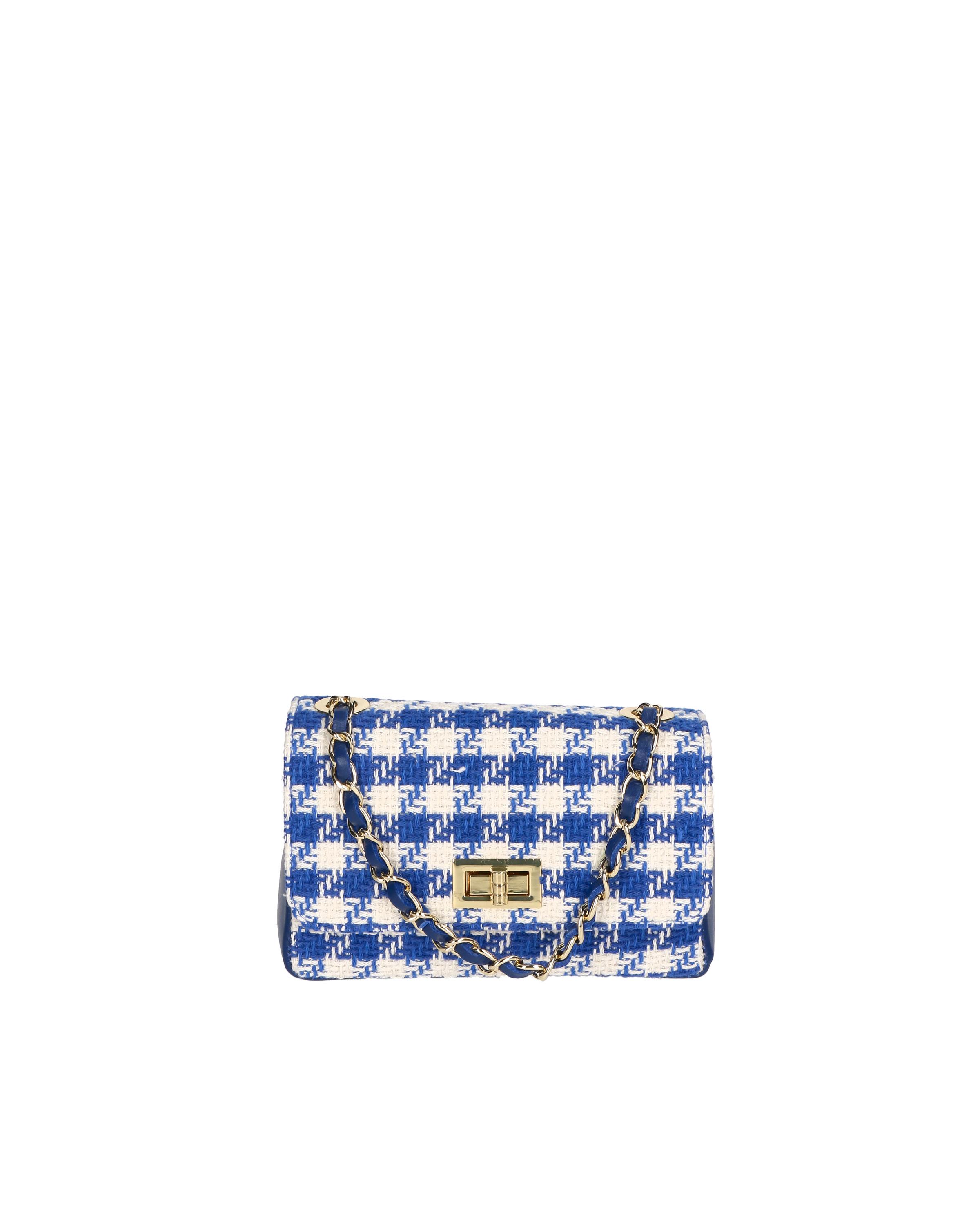Ce sac à bandoulière présente un motif pied-de-poule classique en bleu et blanc, offrant un accessoire sophistiqué pour diverses occasions. Le design comprend une fermeture tourniquet dorée et une bandoulière chaîne entrelacée avec un matériau de couleur crème, offrant à la fois élégance et confort.