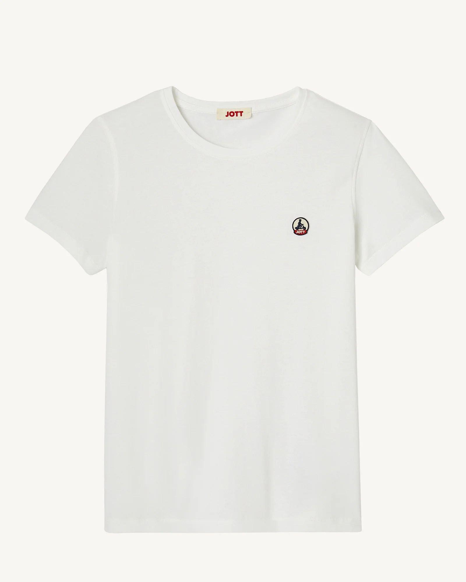 Le T-shirt Rosas à manches courtes est un vêtement décontracté et basique, idéal pour le quotidien, les loisirs ou le travail. Ce t-shirt à manches courtes est confectionné à partir de 86% de coton bio et de 14% de polyester recyclé, offrant une respirabilité et un confort optimal. La couleur blanc pur est parfaite pour être portée avec tout type de vêtement. Le logo de la marque Jott est visible sur la poche gauche, sous forme d'un patch brodé avec un petit motif circulaire et l'inscription "JOTT". Le tissu est fin et léger, offrant une sensation agréable contre la peau. Ce T-shirt est polyvalent et convient à tous les usages.