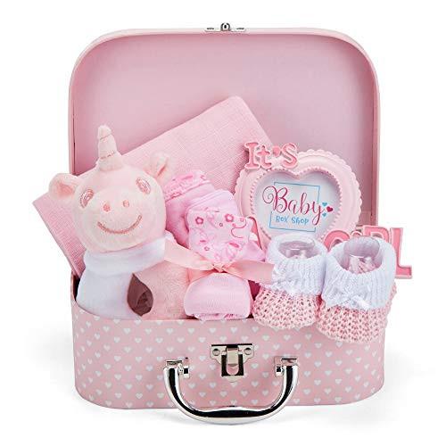 CADEAUX DE BABY SHOWER - Imaginez présenter ces magnifiques cadeaux pour une nouvelle petite fille aux nouveaux parents et leur enthousiasme lorsqu'ils ouvrent le couvercle et voient la collection à l'intérieur. Dimensions de la boîte : 23,8 cm x 15,9 cm x 7,7 cm. Panier bébé fille Vous ne serez pas déçu de la qualité des vêtements de bébé et du cadre photo à l'intérieur de la boîte souvenir au design élégant dans le style d'une valise. Un hochet haut de gamme est complété par un bavoir en coton, des chaussettes pour bébé les plus mignonnes et des moufles et accessoires indispensables à gratter. Un cadre photo IT'S A GIRL en résine solide et une mousseline rose complètent ce coffret cadeau compact. * BIEN ASSEMBLÉS Tous nos paniers pour bébé sont créés individuellement pour offrir une gamme impressionnante de cadeaux pour la petite fille. Si vous recherchez des cadeaux de grossesse, cet arrangement unique constitue un cadeau de départ de maternité idéal.