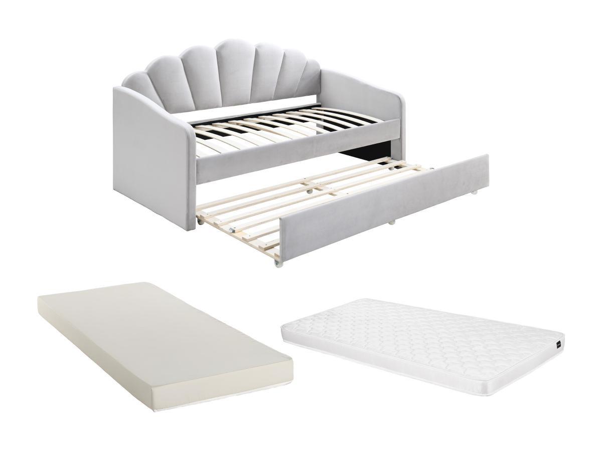 Vente-unique, Lit gigogne coquillage 2 x 90 x 190 cm - Velours - Gris clair + Matelas - ELUSIA