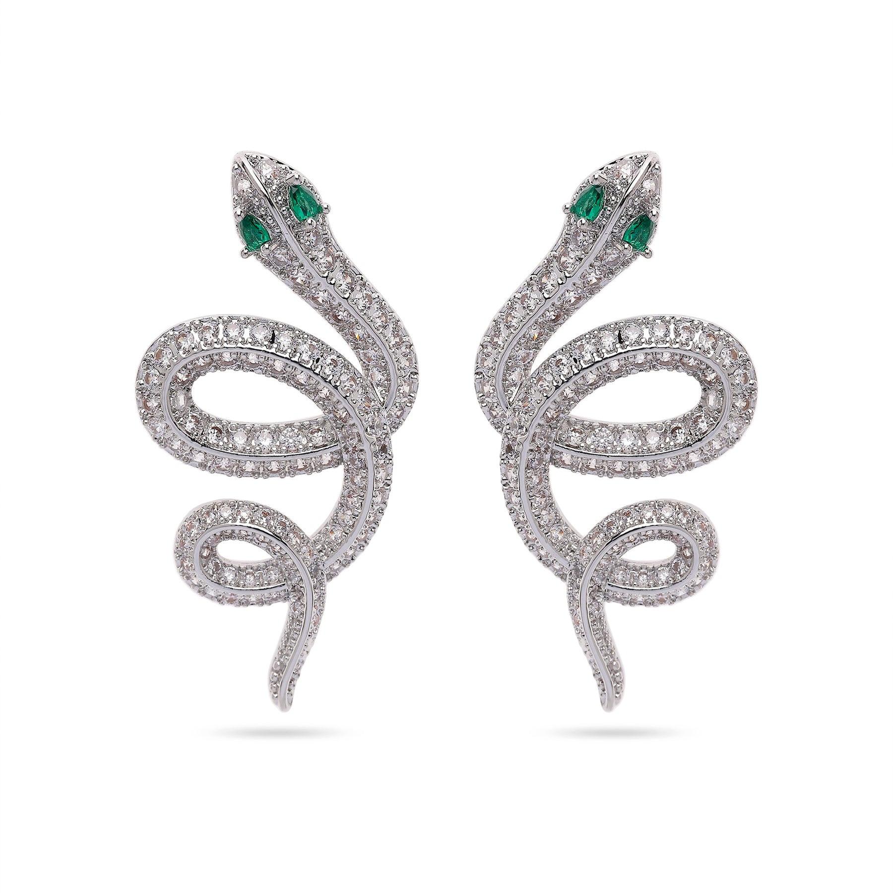 Révélez votre élégance intérieure avec ces boucles d'oreilles Serpent en argent. Conçues selon un motif de serpent envoûtant, ces boucles d'oreilles sont ornées de cristaux scintillants et rehaussées d'yeux en pierres précieuses vertes captivantes. Alliance parfaite de sophistication et d'audace, elles ajoutent une touche de mystère et de glamour à toutes vos tenues. Dimensions : 1,8 cm x 3,8 cm | Placage : Rhodium | Fermoir : Tige et ardillon