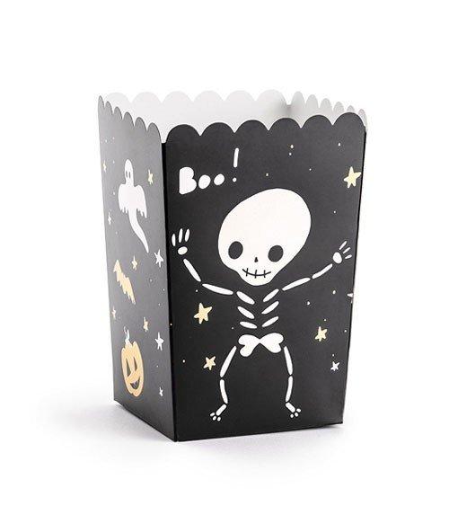 Boîtes à pop-corn BOO! Noir avec imprimé métallisé blanc et or, dimensions une fois plié environ 7 x 7 x 12,5 cm. Pack de 6 boites à pop-corn