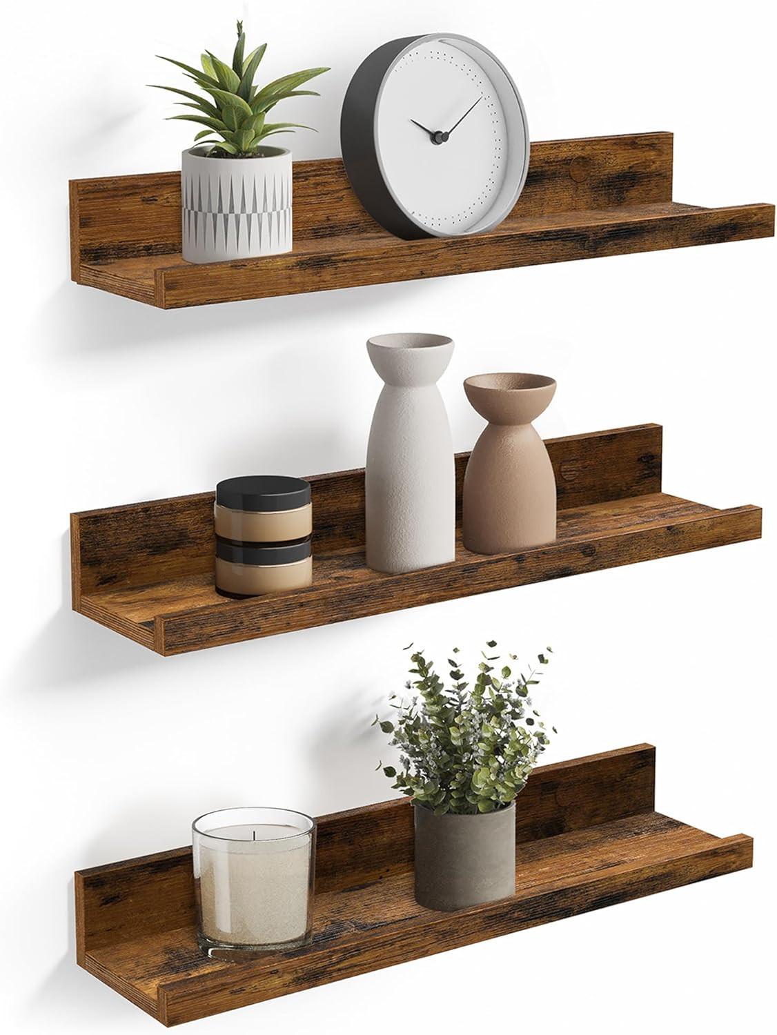 Découvrez le lot détagères murales SONGMICS, la solution parfaite pour un rangement à la fois élégant et pratique ! Avec une longueur de 38 cm et des rebords surélevés, ces trois étagères flottantes sont spécialement conçues pour exposer vos cadres photo préférés tout en empêchant les objets de tomber vers lavant. Fabriquées en panneaux de particules de classe E1 durables, elles offrent une finition brun rustique à la fois esthétique, résistante à lusure et robuste. Chaque étagère supporte jusquà 5 kg, ce qui vous permet dy placer sans souci vos épices dans la cuisine, des livres pour enfants dans la salle de jeux ou encore des objets déco dans le salon. Polyvalentes, elles transforment nimporte quel mur en espace de rangement attrayant. Que ce soit dans un bureau ou un espace de vie, elles sont idéales pour organiser vos pièces avec style. Linstallation est un jeu denfant ! Grâce aux vis fournies et aux trous pré-percés, vos étagères seront fixées en un rien de temps. Vous profitez ainsi rapidement dune solution de rangement décorative et peu encombrante. Le lot comprend trois étagères murales avec rebords à lavant ainsi que deux types de chevilles murales, adaptées aussi bien aux murs pleins quaux cloisons en plaques de plâtre. Apportez à votre intérieur une touche de charme rustique et délégance pratique avec le set détagères murales SONGMICS !