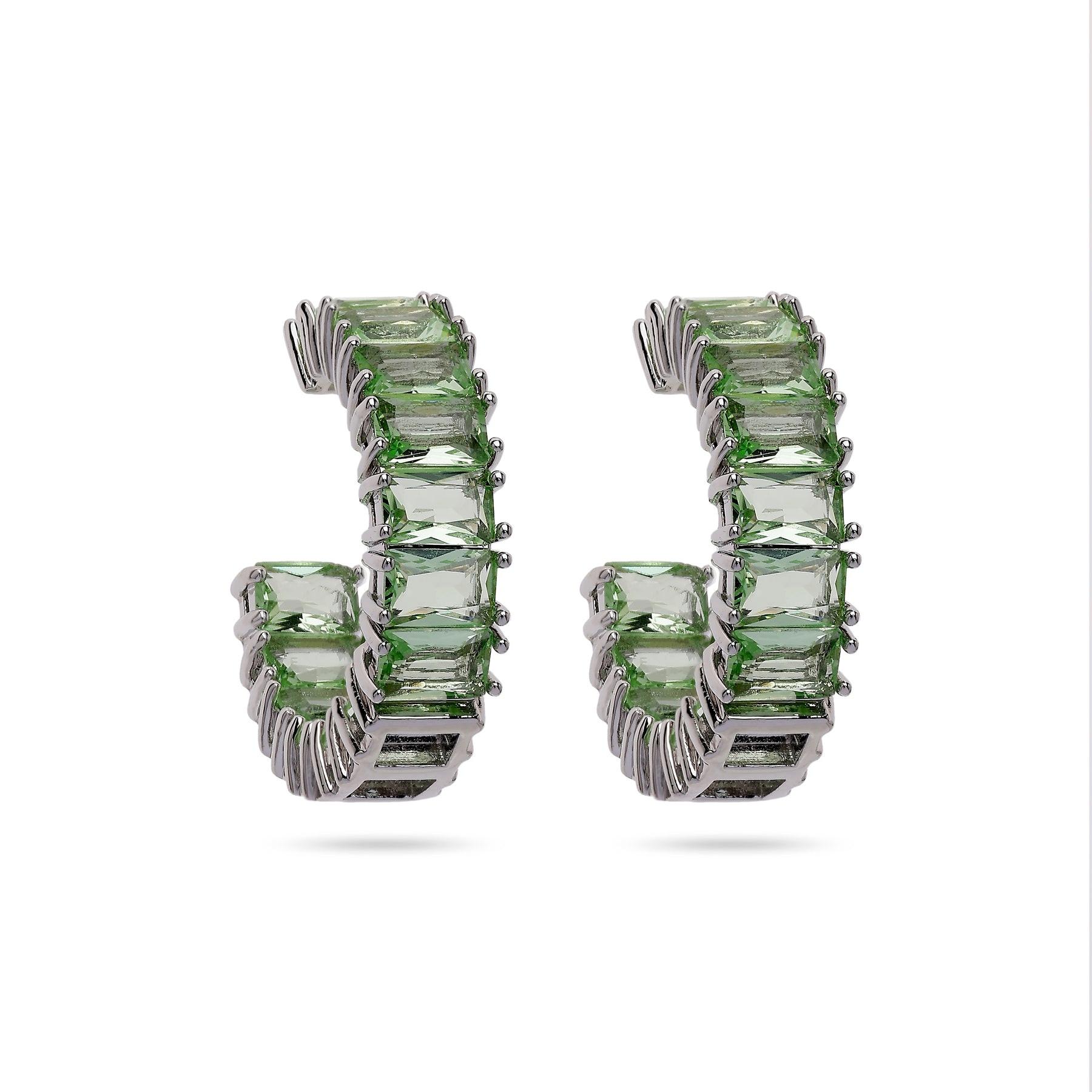 Ces boucles d'oreilles créoles captivantes diffusent une lueur mentholée rafraîchissante. Chaque créole est minutieusement confectionnée avec une série de cristaux vert pâle taillés en carré, sertis dans une élégante monture argentée. Les cristaux captent la lumière avec un chatoiement délicat, créant un éclat à la fois frais et sophistiqué. Leur design géométrique moderne et leur palette de couleurs subtiles en font une pièce maîtresse idéale, ajoutant une touche d'élégance contemporaine à toute tenue. Dimensions : 0,7 cm x 2,7 cm | Placage : Rhodium | Fermoir : Tige et ardillon