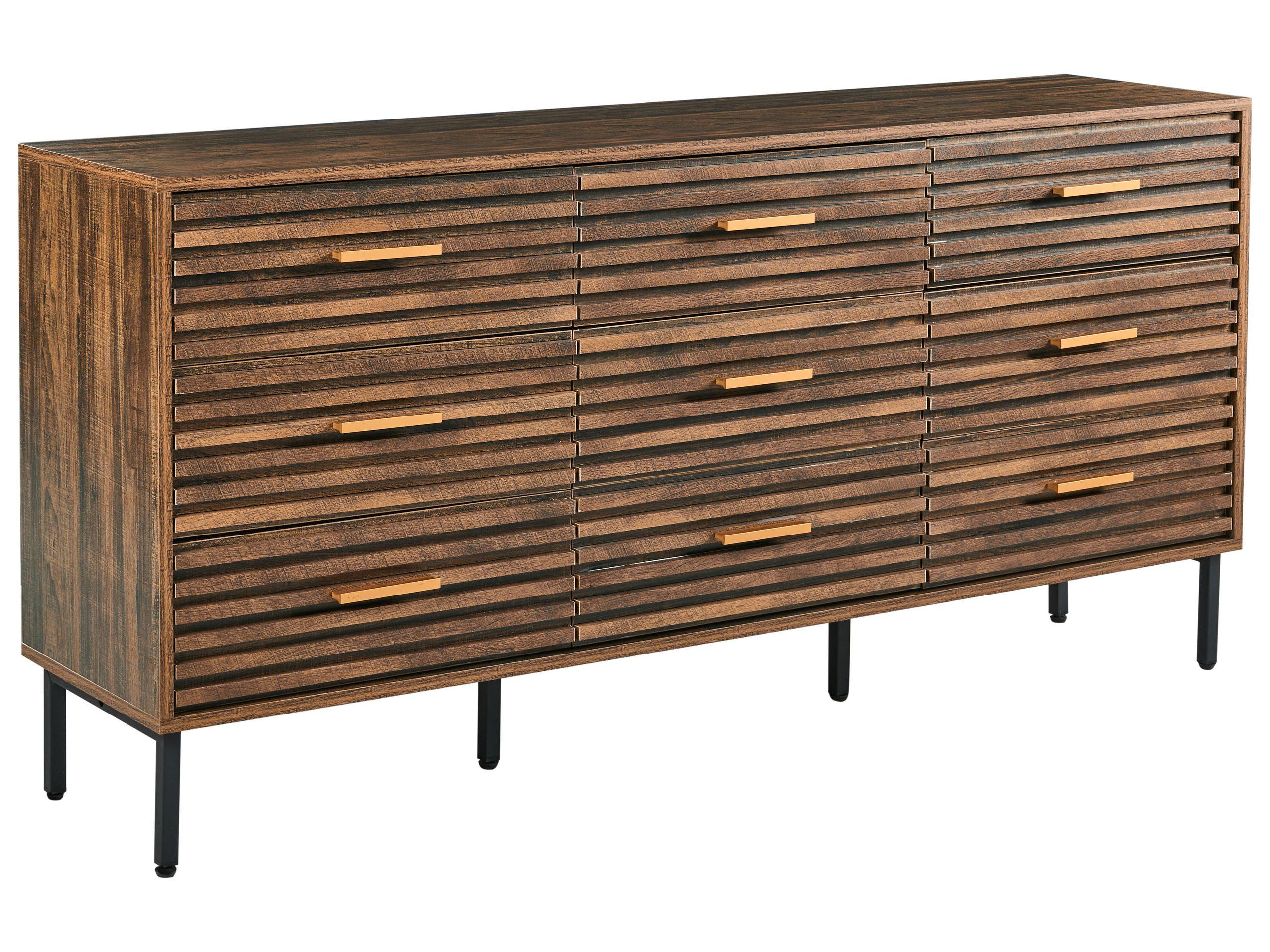 Commode spacieuse avec pieds métalliques. Cette commode allie à la perfection élégance intemporelle et fonctionnalité, s'intégrant parfaitement dans les salons ou les chambres à coucher contemporains. Son cadre en MDF durable, soutenu par de solides pieds en fer noir, présente une finition imitation bois. La commode comprend neuf tiroirs de grande taille, offrant un espace de rangement pratique et généreux.