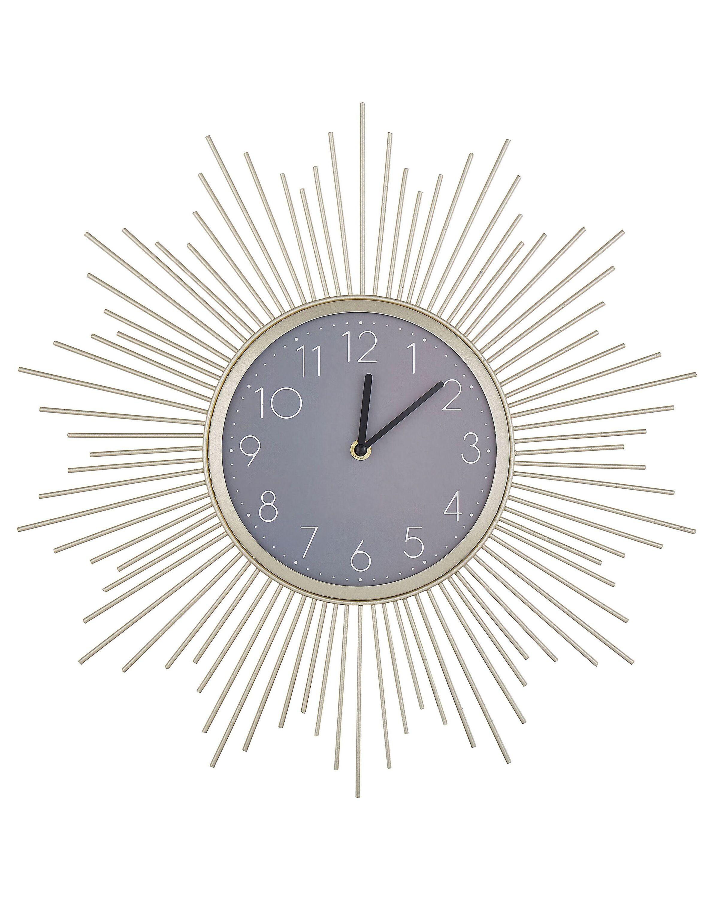 Horloge murale dorée en forme de soleil avec fond gris de style moderne. Cette élégante horloge murale en forme de soleil ravivera le décor de votre pièce. Sa forme glamour créée avec des tiges en métal doré et une structure en MDF gris est un excellent ajout à tout salon ou chambre à coucher. L'horloge reste cependant pratique, avec un cadran simple et clair à chiffres arabes pour une lecture aisée de l'heure.