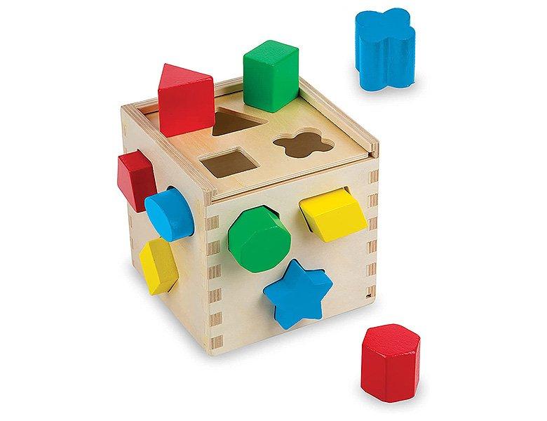 Dieser Formensortierer beinhaltet 12 dicke, farbenfrohe Formen, die beim Einlegen in den Holzwürfel ein Geräusch machen. Der Würfel verfügt über einen abnehmbaren Deckel, sodass die Teile leicht entnommen werden können. Die kompakte Grösse von 14 x 14 cm macht ihn ideal für kleine Hände. Ein klassisches Spielzeug zur Förderung der motorischen Fähigkeiten von Kleinkindern.